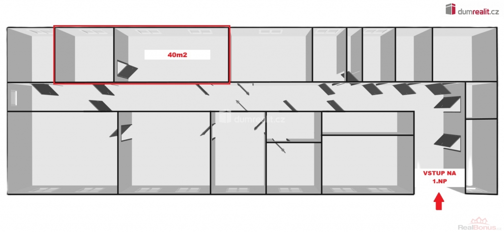 (+ zálohy na energie a služby), Dumrealit.cz Vám zprostředkuje pronájem kanceláře 40m užitné plochy. Kancelář se nacházejí v 1.NP cihlové budovy na okraji Podivína. Kancelář je tvořena dvěma místnostmi (26,5m a 13,5m) každá má vstup z centrální chodby, ale jsou i průchozí navzájem. V jedné z místností se nachází přívod vody a odpad, čímž tu vzniká možnost vybudovat si kuchyňku. Sociální zázemí naleznete na centrální chodbě, společné pro celé patro. Budova je součástí rozlehlého areálu, který je opatřen závorou. Parkování možné před areálem nebo přímo v areálu za poplatek 300,- Kč/auto. Nájemné činí 3.000,- Kč, zálohy na energie a služby budou nastaveny dle vytíženosti a počtu osob. Při podpisu smlouvy bude požadována úhrada vratné kauce 12.000,- Kč a provize RK ve výši 1měsíční nájemné +DPH. V nabídce další rozměry kanceláří, možno kombinace více prostorů nebo rovnou celého patra. Prostory jsou volné, připravené k okamžitému užívání. Kontaktujte nás pro více informací a domluvte si prohlídku. Ev. číslo: 651170. Energetický štítek: G