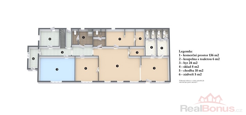 Přízemí: zádveří, chodba, komerční prostor se zázemím, ubytovací jednotka, koupelna s toaletou, sklad a schodiště do podkroví