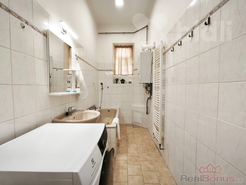 * Koupelna s vanou, umyvadlem, otopným žebříkem, pračka se sušičkou