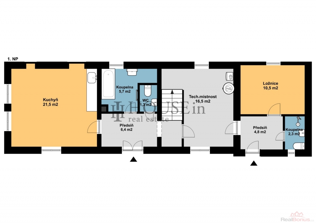 Dům má dvě nadzemní podlaží. V přízemí se nachází prostorná kuchyň, technická místnost, ložnice, dvě koupelny, samostatné WC a dvě předsíně. Z ložnice a předsíně by bylo možné připravit samostatnou garsonku s vlastním vstupem, což nabízí možnost pronájmu nebo dvougeneračního bydlení.