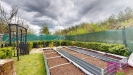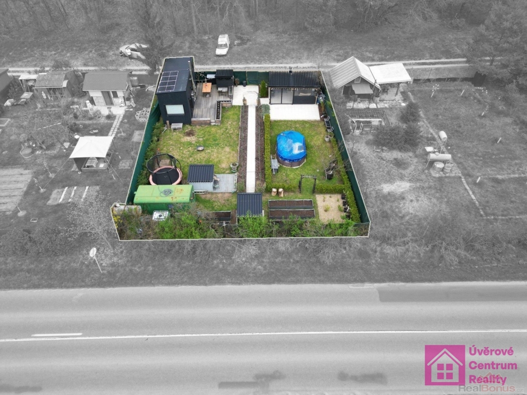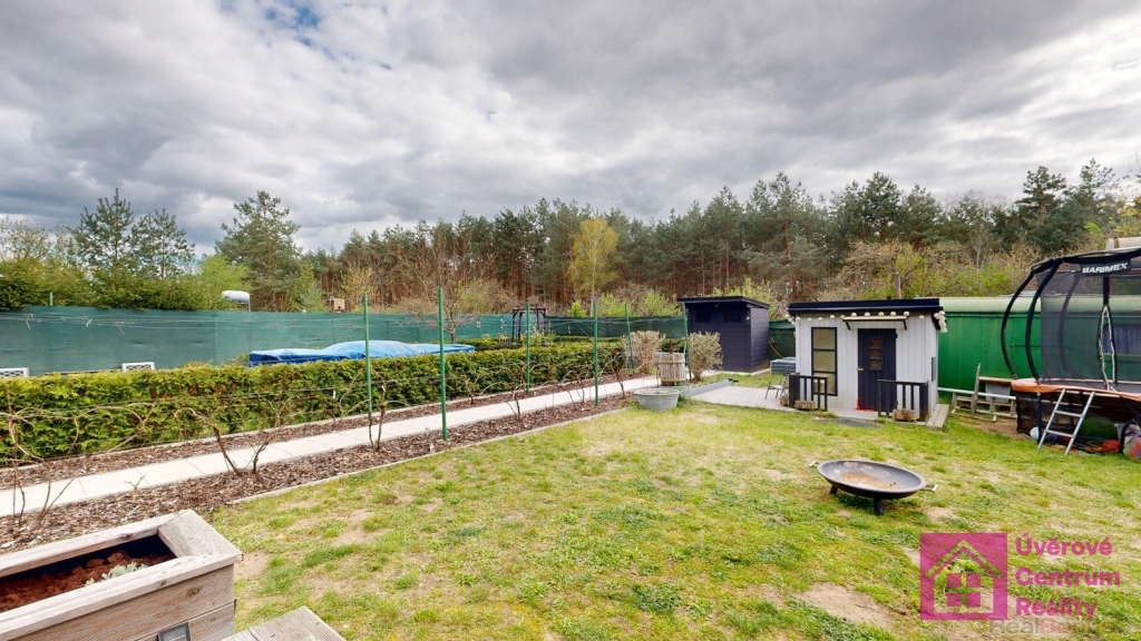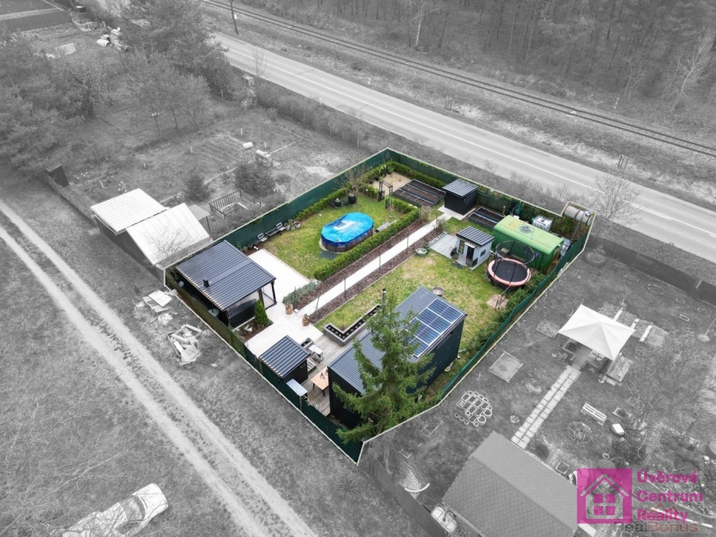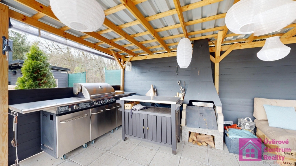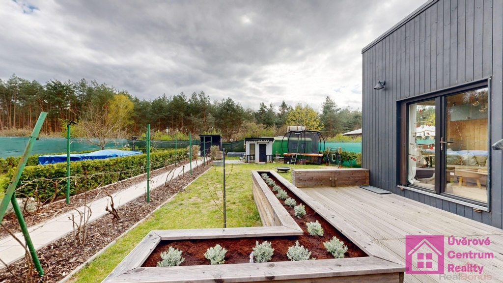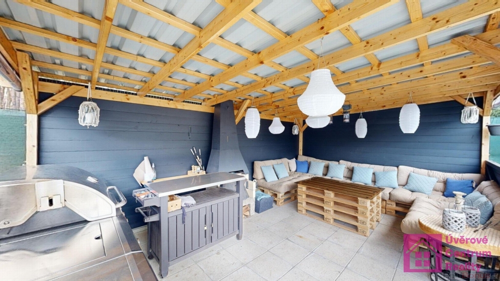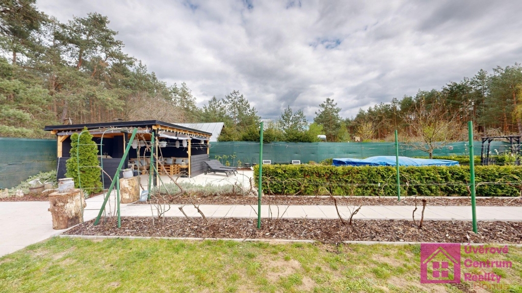 Pergola s krbem a zástěnami s paletovým posezením, matracemi, stolem z palet a skla. Dvě venkovní boudy. V první je úschovna na kola plus malý sklep a ve druhé keramické wc, kamenné umyvadlo a sprchový kout na solární sprchu. Zelená maringotka pro úschovu nářadí atd. 5x vyvýšené záhony, nadzemní bazén s příslušenstvím, trampolína, dětský domeček s terasou. Velká terasa s levandulemi, stůl a paletové posezení s matrací a šicím strojem na boty jako stoleček. Veškeré solární osvětlení zahrady a dva bečáry na dešťovou vodu.