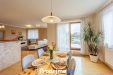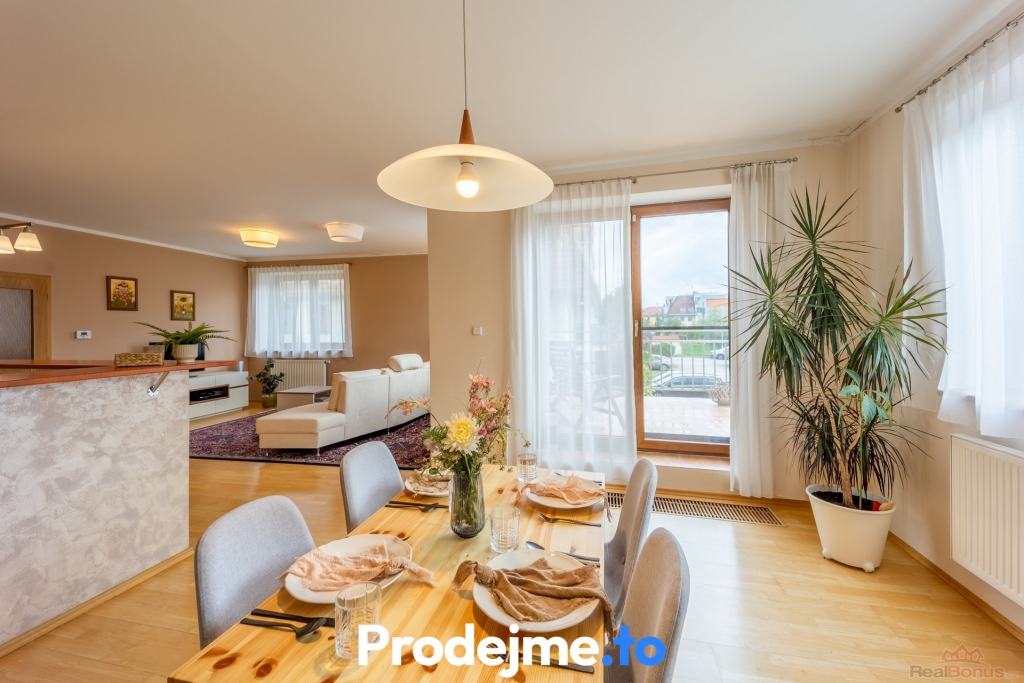 Byt má vlastní vchod v přízemí, obytná část je v prvním patře. Dominantou je velkorysý obývací pokoj s kuchyňským koutem a jídelnou o ploše 50,7 m2 a s výborným přirozeným světlem. Kuchyň je plně vybavená (mimo lednici), doplněná o ostrůvek a poskytuje dostatek místa pro vaření i rodinné setkávání. Z jídelny se vstupuje na terasu - ideální pro ranní kávu i letní posezení.