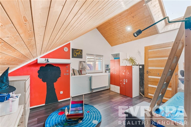 V patře jsou dva pokoje, ložnice (16,17 m2) a dětský pokoj (17 m2) a chodba (13,14 m2) a malá šatnička.