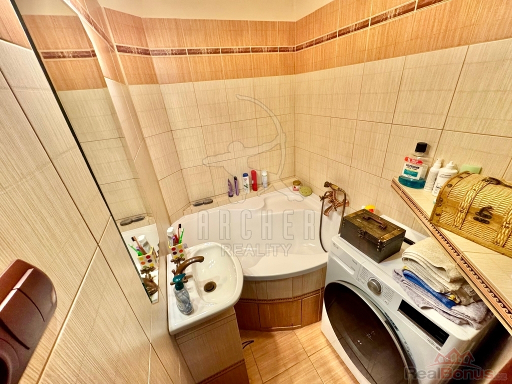 Z předsíně je vstup do koupelny s rohovou vanou a umyvadlem. Je zde také místo pro pračku. Toaleta má samostatnou místnost. Obě tyto místnosti mají podlahové topení. Z předsíně je také vstup na balkón 1,3m2.