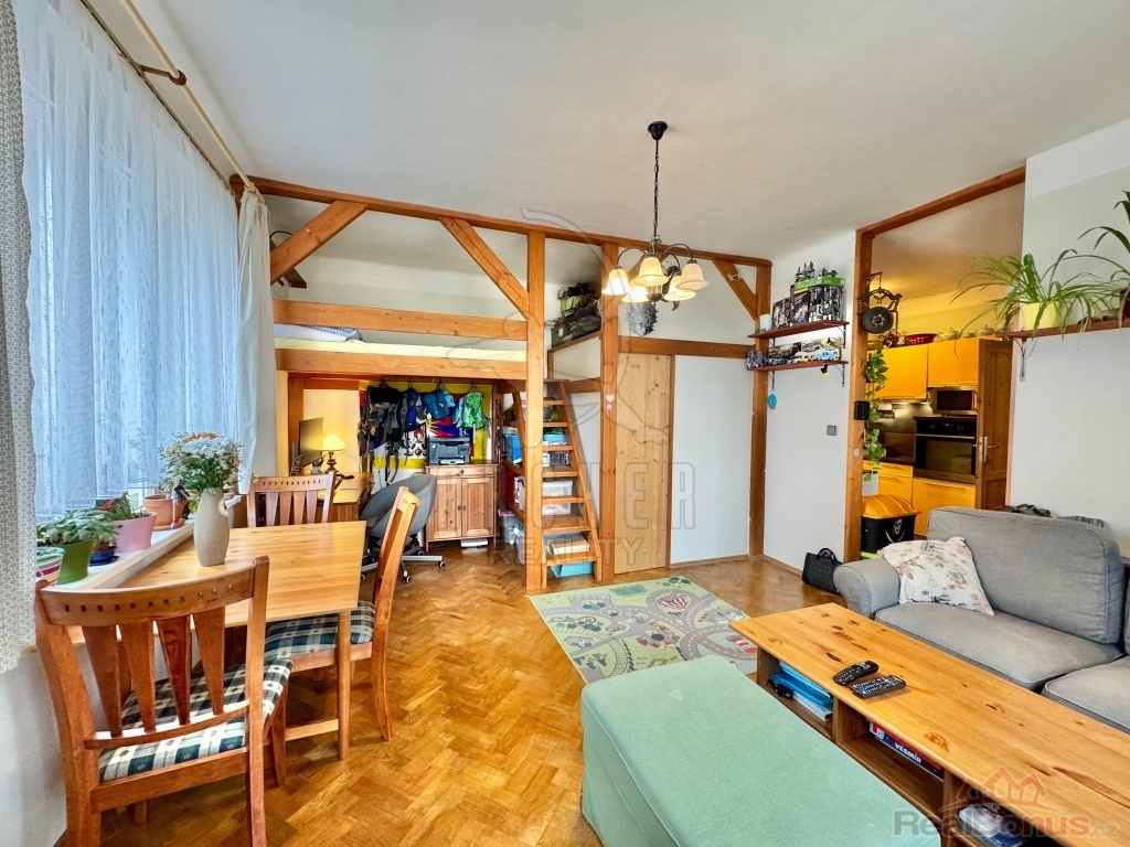 Obývací pokoj je světlý a prostorný. Zahrnuje obývací část s sedací soupravou a stolkem, jídelní část s jídelním stolem. Dále lehkým patrem rozdělený prostor na pracovní kout se stolem, šatnu s posuvnými dveřmi a dvojpostel a úložný prostor na patře. Pokoj je širokým průchodem napojen na kuchyňský kout vybavený designovou linkou ve tvaru U. Ta je plně vybavena spotřebiči včetně keramické varné desky a je zde spousta úložného prostoru.