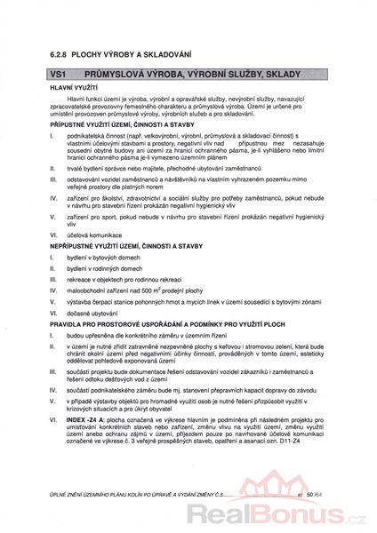 Územní plán města řeší areál jako VS1 PRŮMYSLOVÁ VÝROBA, VÝROBNÍ SLUŽBY, SKLADY. Regulativy ÚP jsou uvedeny v obrazové části inzerce.