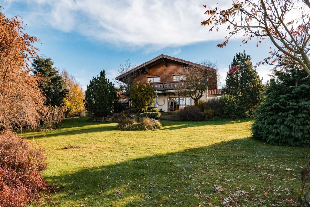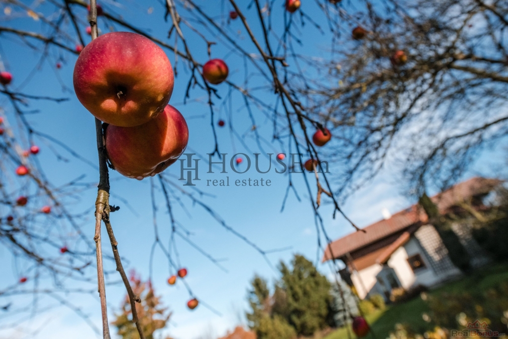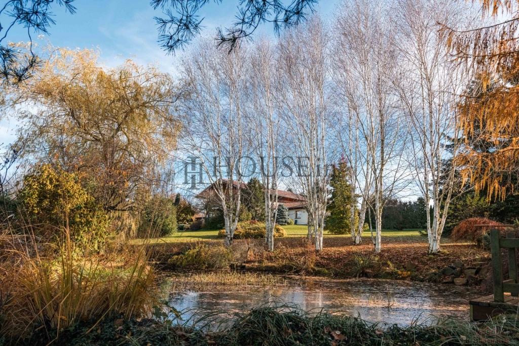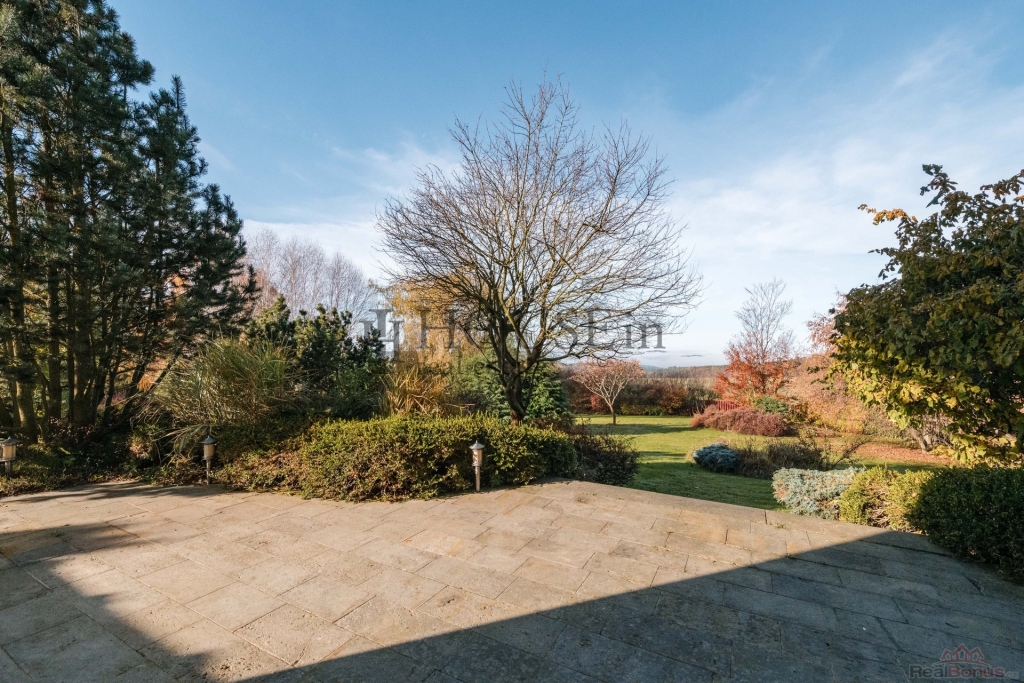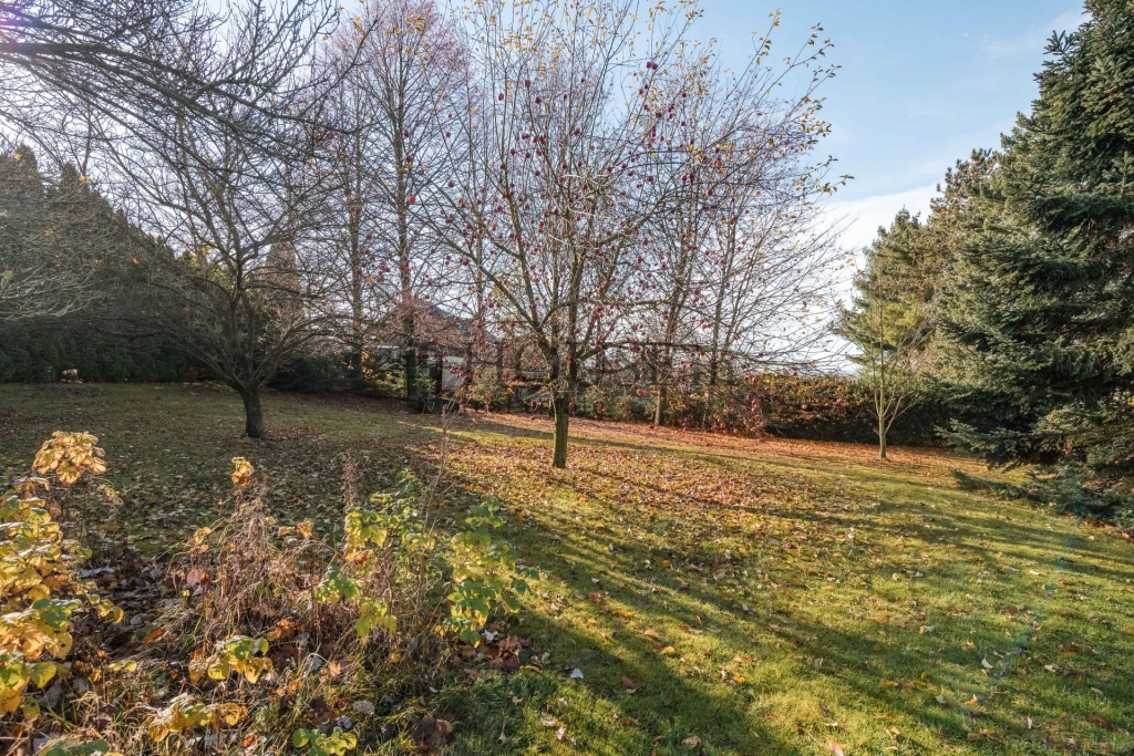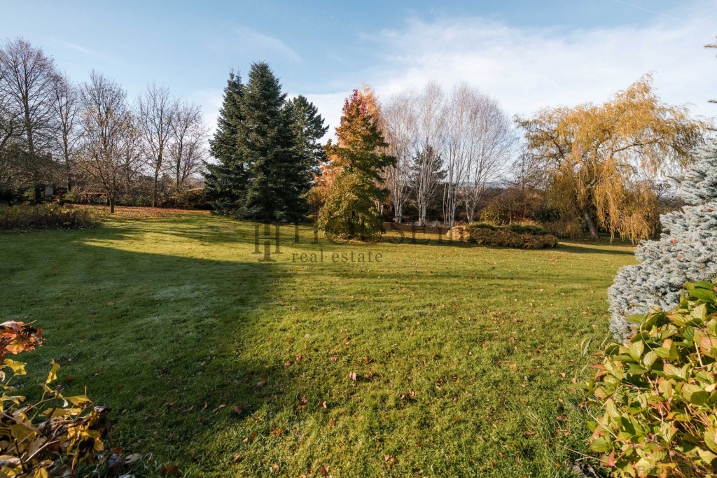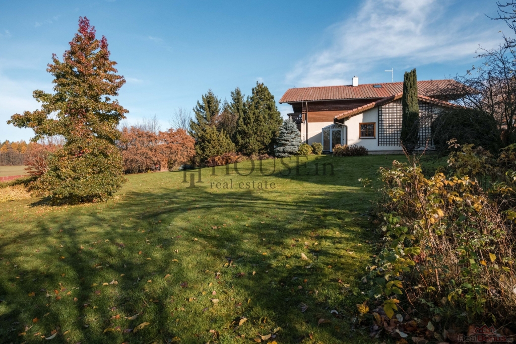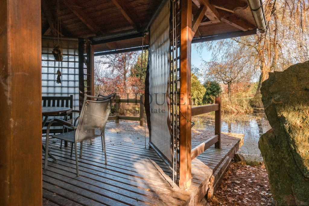 Zahrada je vkusně upravená s vzrostlými thuji, jedlemi, smrky, borovicemi, stříbrným smrkem, modřínem, břízami, keři (bokovišně, ambroň) a užitkovými stromy (ořech, mirabelky, jabloň, slivoň). Na pozemku se nachází fóliové jezírko s hloubkou 2 m napájené z vrtané studny hl. 38 m ? voda ze studny zároveň slouží pro závlahový systém trávníku a rostlin. Do jezírka vtéká potůček přes malý vodopád, který přidává zahradě příjemný zvukový efekt a pocit soukromé oázy. U jezírka stojí dřevěný altán s podlahou protaženou nad vodní hladinu ? ideální místo pro posezení, relaxaci nebo večerní atmosféru u vody. Další altán je umístěn v jiné části zahrady pro variabilní využití. Terasa u domu je z pískovce, což podtrhuje přírodní charakter zahrady a navazuje na použití přírodního kamene na dvoře. Trávník je udržován traktůrkem a sekačkou značky Castel Garden a Husqvarna Rider.