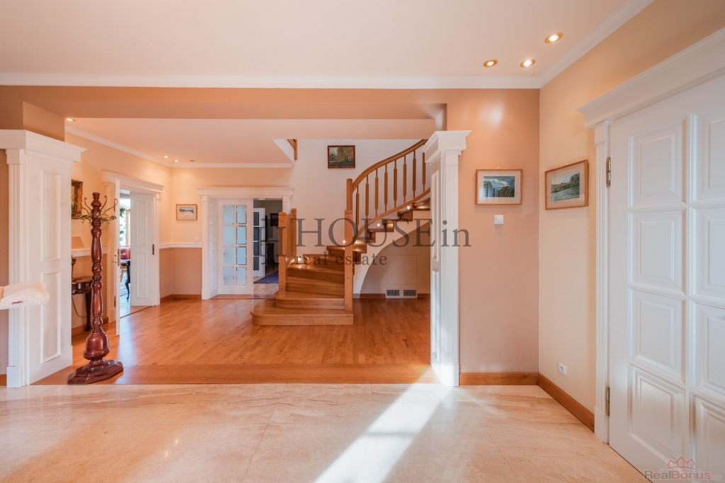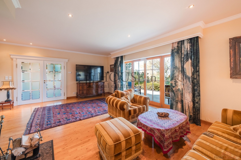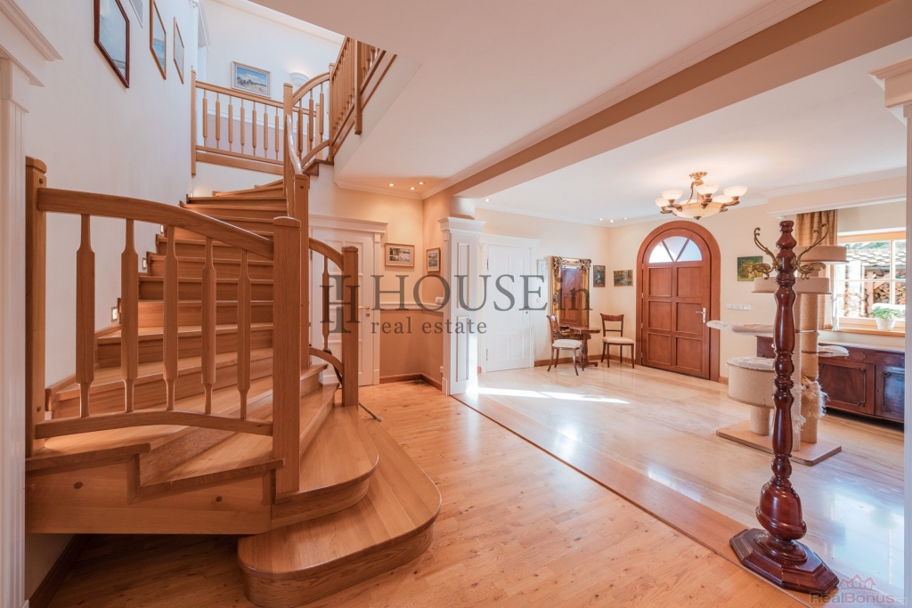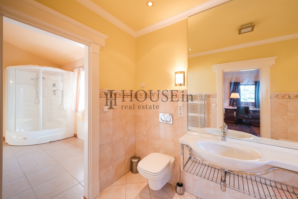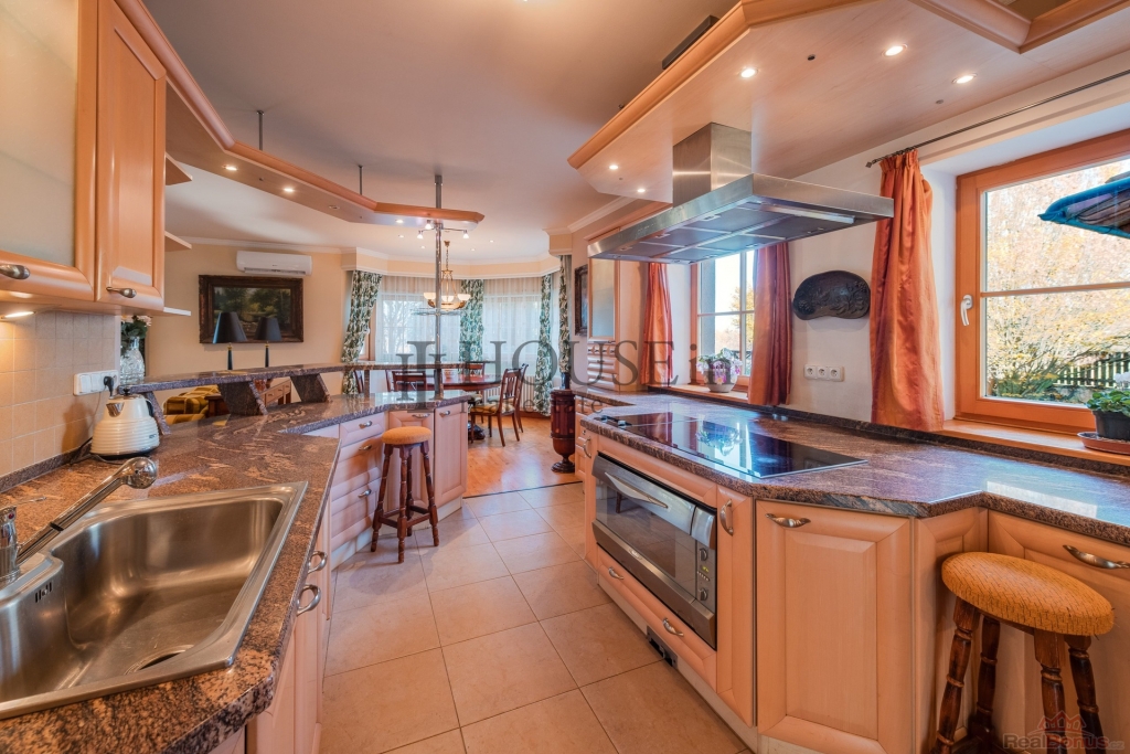 Kuchyňská linka je kompletně vybavena ? dřez a baterie zn. Franke, odsavač Miele, varná deska a trouba Siemens, mikrovlnná trouba Siemens, drtič odpadu, halogenové osvětlení a další prémiové prvky. V kuchyni jsou navíc elegantní pracovní desky ze žuly, které podtrhují nadstandardní úroveň vybavení. V obývacím pokoji v přízemí a v ložnici v patře se nachází mramorem obložený krb s vložkou, který dodává interiéru výjimečnou atmosféru a zároveň doplňuje systém vytápění. Ve všech pokojích jsou provedeny fabiony ? zaoblené přechody mezi stěnou a stropem, které interiéru dodávají luxusní a čistý vzhled. Nábytek na fotografiích může zůstat po dohodě. Mezi speciální vybavení patří masážní sprchový kout zn. Jacuzzi, vířivá vana La Futura Aqualina, centrální vysavač a venkovní zděný gril. Internetové připojení je zajištěno přes bezdrátovou parabolickou anténu od internethned.cz nebo lze připojit klasickou telefonní linku.