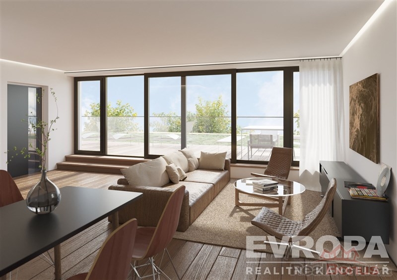 Dominantou bytu je prostorný, mimořádně světlý obývací pokoj s kuchyňským koutem o rozloze 33 m, který se otevírá přímo na terasu a dál plynule přechází do zahrady. Díky tomu působí celý obytný prostor vzdušně, propojeně a dokonale harmonicky. Součástí kuchyňské části je praktická spíž, praktický prvek moderní domácnosti, který přináší pořádek, pohodlí i skvělé úložné možnosti.