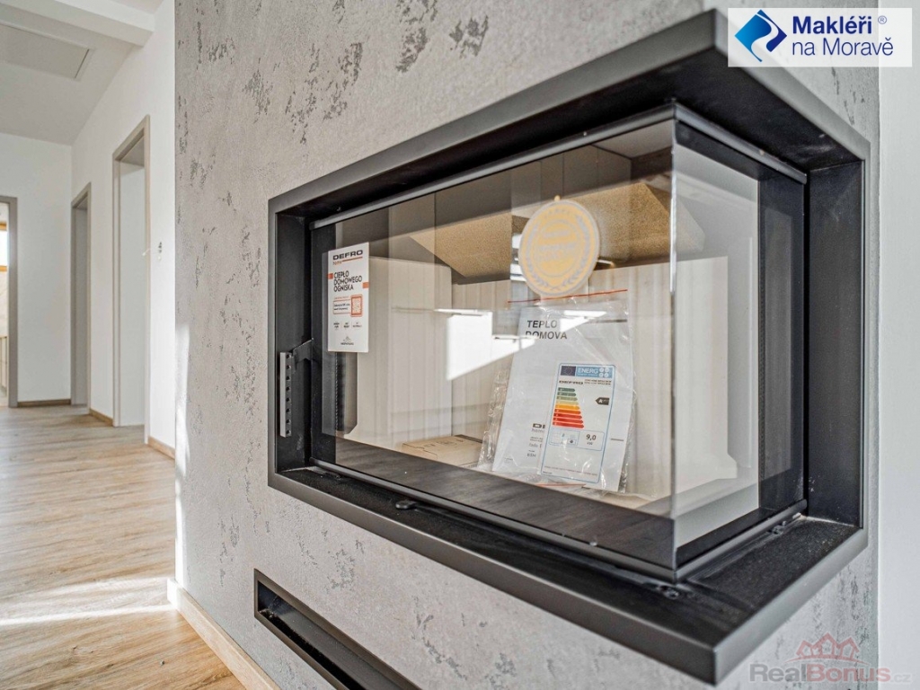 Alternativní vytápění zastane interiérový krb na dřevo s bočním otevíráním horkovzdušné vložky.