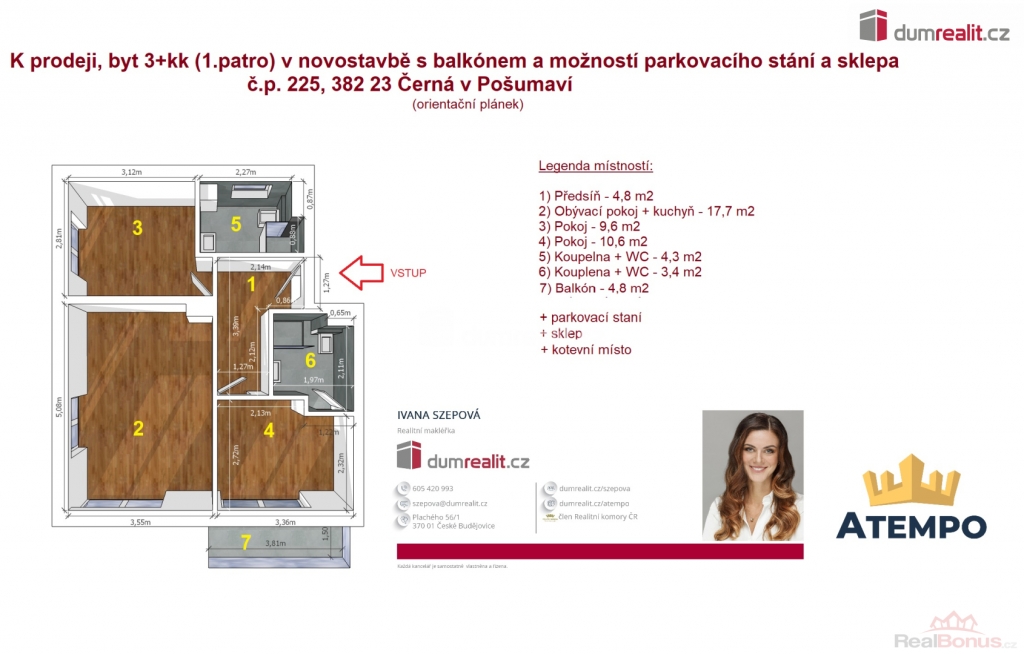 Cena je včetně prakovacího stání, sklepa, provize RK a právního servisu. Více informací Vám poskytne, Dumrealit.cz Vám zprostředkuje prodej bytové jednotky 3+kk s balkónem v moderní novostavbě, s parkovacím stáním a sklepem v obci Černá v Pošumaví, č.p. 225, u Lipenské vodní nádrže. Dispozice bytové jednotky naleznete na orientačním plánku mezi fotografiemi. Byt je situovaný na jižní a západní světovou stranu. Dostatek světla v bytě zajišťují posuvná francouzská okna s izolačními trojskly. Prodávaný byt o výměře 52,82 m se nachází v zatepleném zděném bytovém domě s výtahem. Bytový dům byl zkolaudován v roce 2023. Dále je možno dokoupit kotevní místo za 250.000,-Kč. Vytápění zajišťuje tepelné čerpadlo napojené na podlahové topení. Bytový dům je napojen na elektřinu, veřejný vodovod a obecní kanalizaci. Úklid společných prostor zajišťuje úklidová služba. Veškerá občanská vybavenost (škola, mateřská školka, obchod, restaurace, pošta, autobusová zastávka) je v docházkové vzdálenosti. Byt se nachází přímo u Lipenské vodní nádrže - Malé Lipno a u cyklostezky. Okolí Lipenské vodní nádrže je známé tím, že se zde nachází zázemí pro letní i zimní sporty (sjezdovky, cyklostesky, stezka korunami stromů, bobová dráha, lanový park, atd.). Doporučuji osobní prohlídku, byt je po nainstalování kuchyňské linky připraven ihned k nastěhování. Více informací Vám poskytne makléřka Ivana Szepová z realitní kanceláře A TEMPO fungující pod ochrannou známkou dumrealit.cz. Zajistíme Vám financování a veškerý právní servis. Ev. číslo: 652499. Energetický štítek: C (115 kWh/m2/rok).