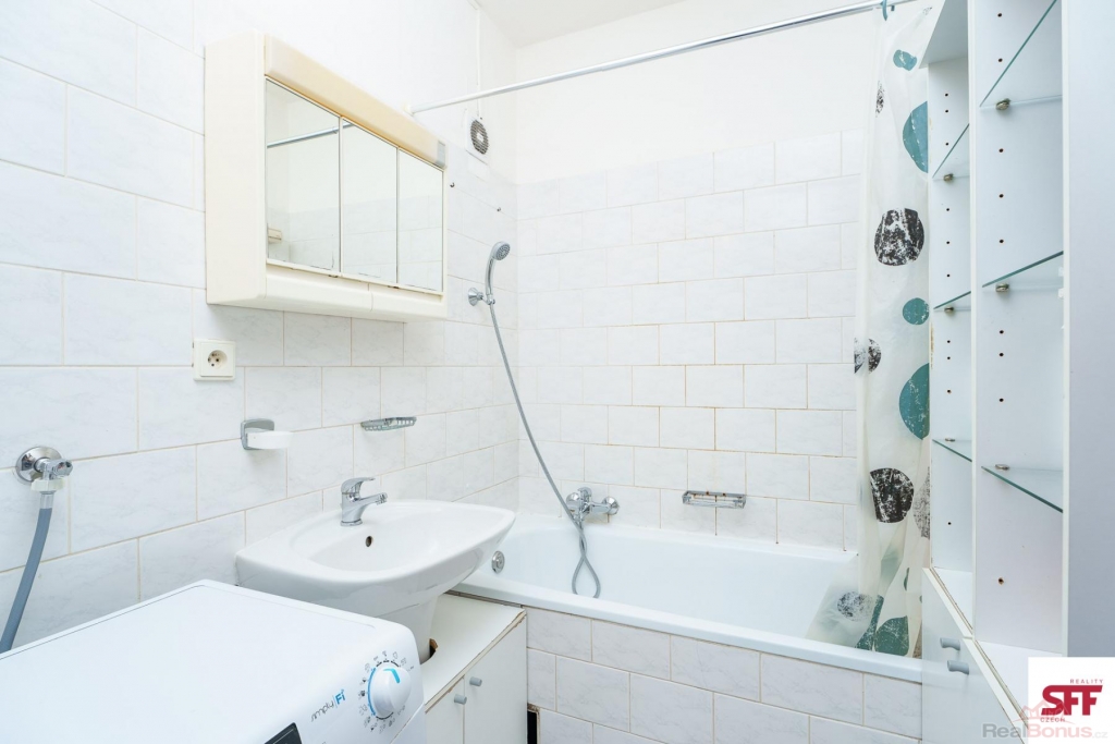 K dispozici je koupelna s vanou, umyvadlem a pračkou, samostatné WC a úložná komora. Úklid společných prostor (kuchyně, koupelna, WC) je zajištěn 2x měsíčně a je zahrnut v ceně nájmu.