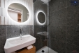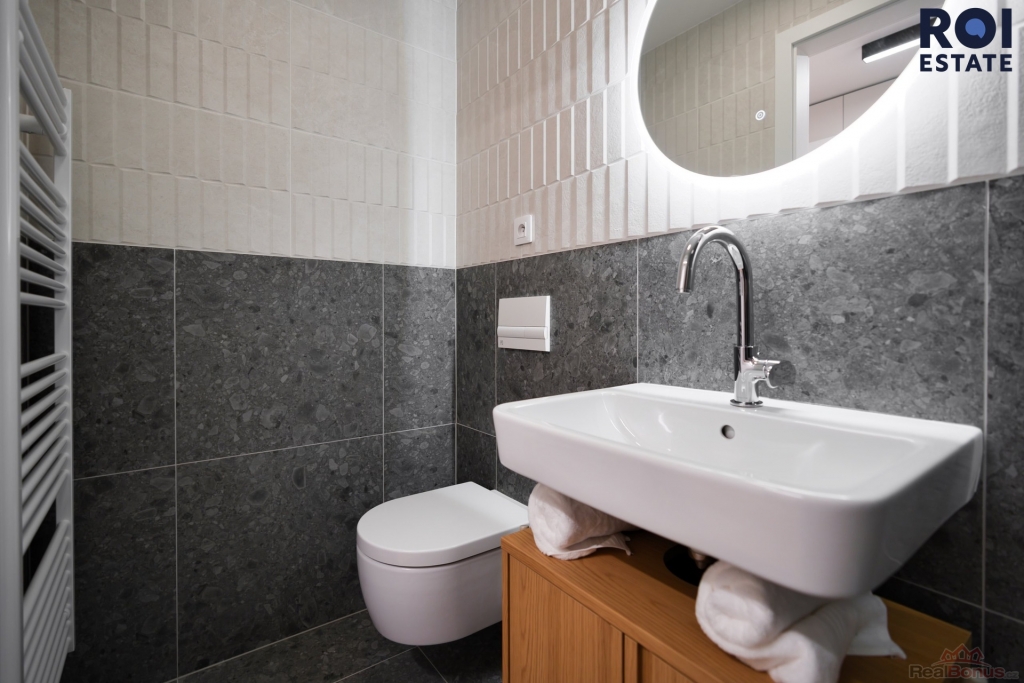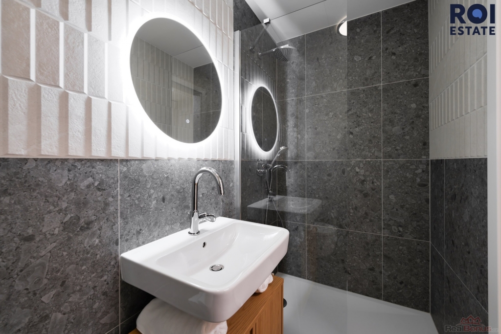 Koupelna vás překvapí svou kvalitou ? obklad v kamenném dekoru, sprchový kout se skleněnou zástěnou, designové kulaté zrcadlo s podsvícením a umývadlo na dřevěné skříňce tvoří příjemnou kombinaci moderního wellness stylu.