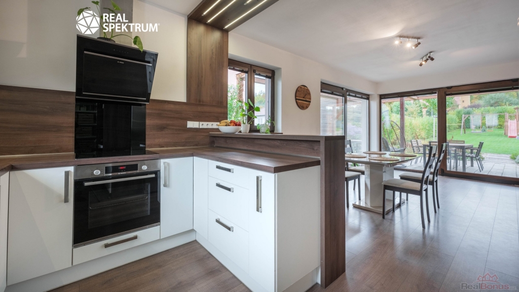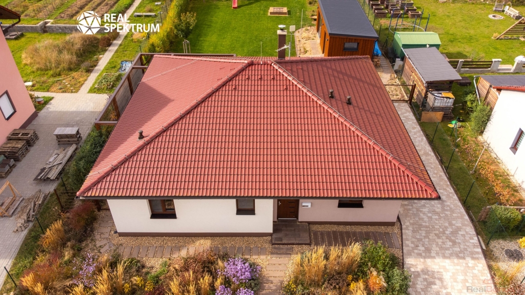 Na první pohled vás jednoznačně upoutá vzrostlá zahrada s pochozími chodníky, která podtrhuje krásu místa hned z ulice. Vstup do domu je orientován na východ. Tento zděný nepodsklepený dům s užitnou plochou 107m2 je předdefinovaný jako 4+kk, kde dominantou domu je prostorný obývací prostor s jídelnou a kuchyní o ploše 44 m2. Francouzské dveře rozšiřují komunikační zónu o krytou terasu se západní orientací. Skvělým benefitem je přímý výhled z kuchyně do zahrady, takže děti i návštěvy snadno obstaráte doslova mrknutím oka. Teplo domova vytváří nejenom jednotně sladěný interiér, ale taky krbová kamna, na které koukáte rovnou z pohovky. Vytápění celého domu je dále zajištěno podlahovým topením. Dispozice domu je do detailu dobře promyšlená - celý interiér působí vzdušně, prakticky a přitom nabízí dostatek úložných prostor pro rodinu i aktivní páry.