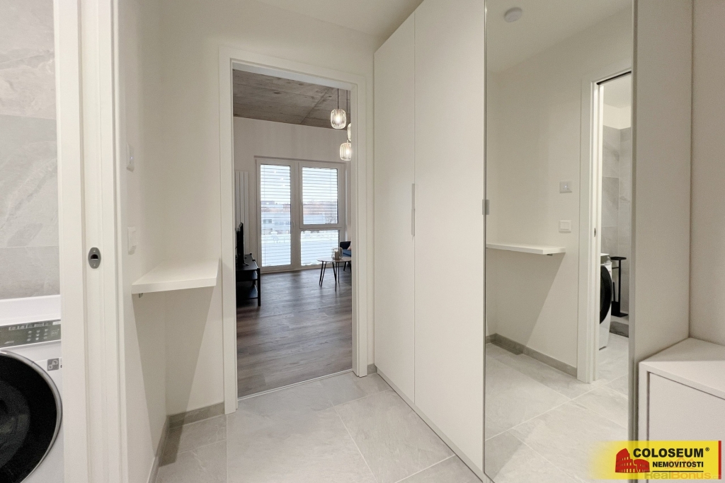 Byt je kompletně vybaven zcela novým kvalitním nábytkem. Součástí je kuchyňská linka na míru s vestavěnými spotřebiči a mikrovlnnou troubou, jídelní stůl se židlemi, obývací část s pohodlnou pohovkou, stolkem, televizí a TV stolkem a ložnice s postelí, šatní skříní a pracovním stolem. V předsíni se nachází prostorná vestavěná skříň a botník. V koupelně je k dispozici pračka. Komfort bydlení doplňují elektrické venkovní žaluzie, okna s trojskly a řízené větrání s rekuperací.