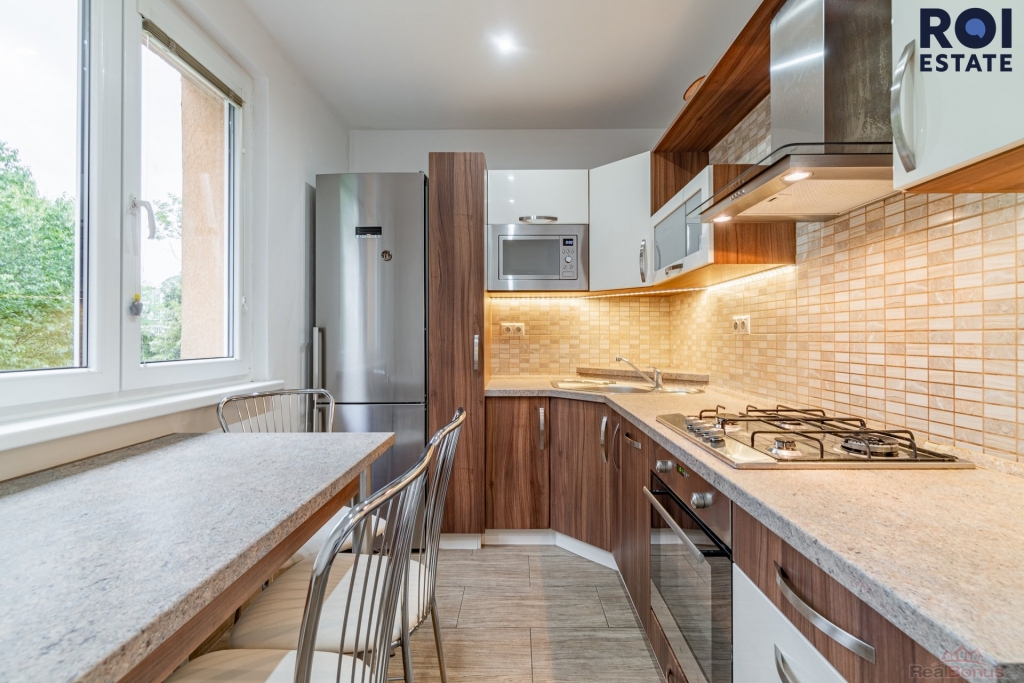 Nabízíme k prodeji zrekonstruovaný byt 2+1 o rozloze 51 m2. Byt disponuje dvěma neprůchozími pokoji. Ložnicí s manželskou postelí, nočními stolky, a šatní skříní a obývacím pokojem se vstupem na lodžii, ve kterém najdete dvě komody a skříň. Další úložný prostor nabídne chodba s vestavěnou šatní skříní odkud se dostanete na samostatnou toaletu, do koupelny se sprchovým koutem a pračkou, a nakonec do kuchyně, která je vybavena vestavěnou myčkou na nádobí, mikrovlnou troubou, el. troubou s plynovým sporákem a kombinovanou lednicí s mrazákem. Zajisté uvítáte i jídelní stůl se židlemi.
