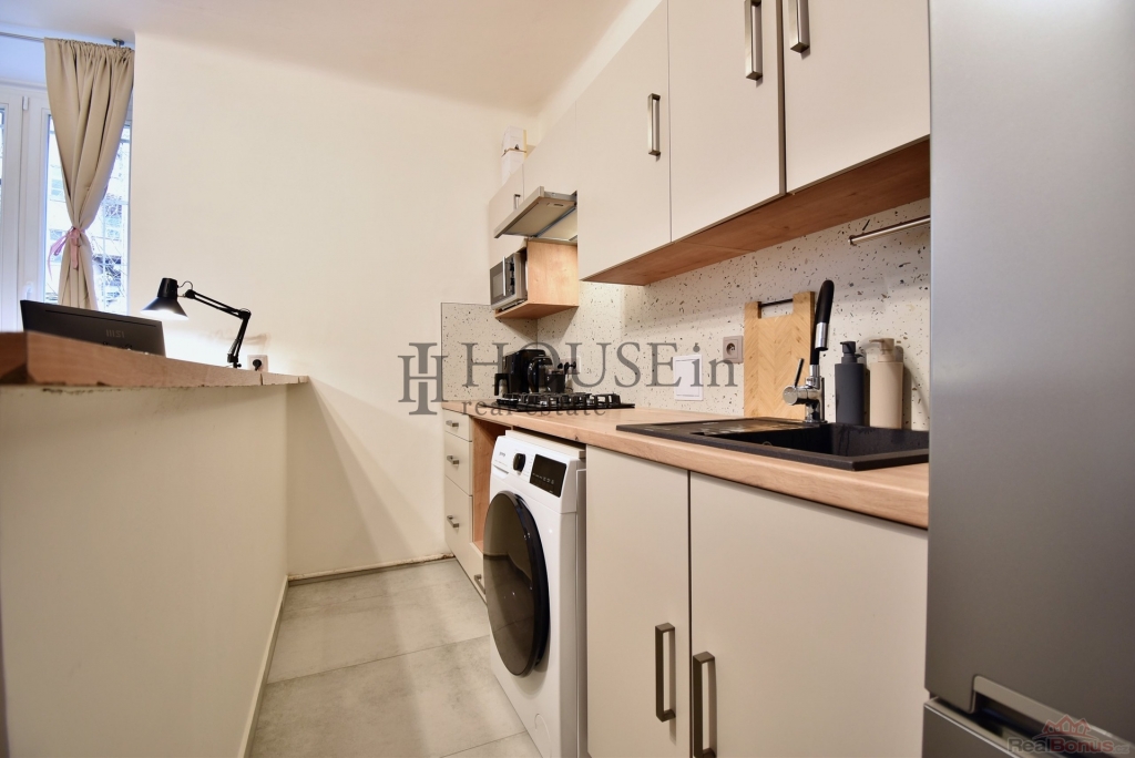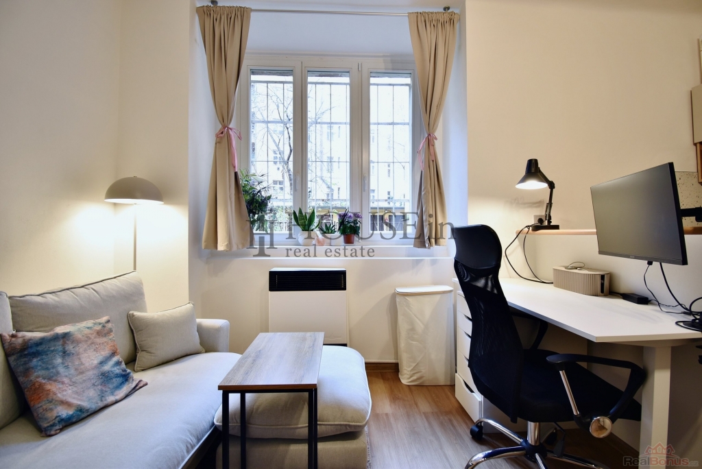 Ateliér je orientován do tichého vnitrobloku. Dispozici tvoří předsíň, koupelna se sprchovým koutem a WC a obytná místnost s kuchyňským koutem a barovým pultem. Jednotka je částečně zařízená ? nábytek může zůstat po domluvě s majitelem. Kuchyňská linka je vybavena lednicí s mrazákem, plynovým sporákem, digestoří a pračkou. Vytápění je zajištěno plynovými WAW, ohřev vody elektrickým bojlerem.