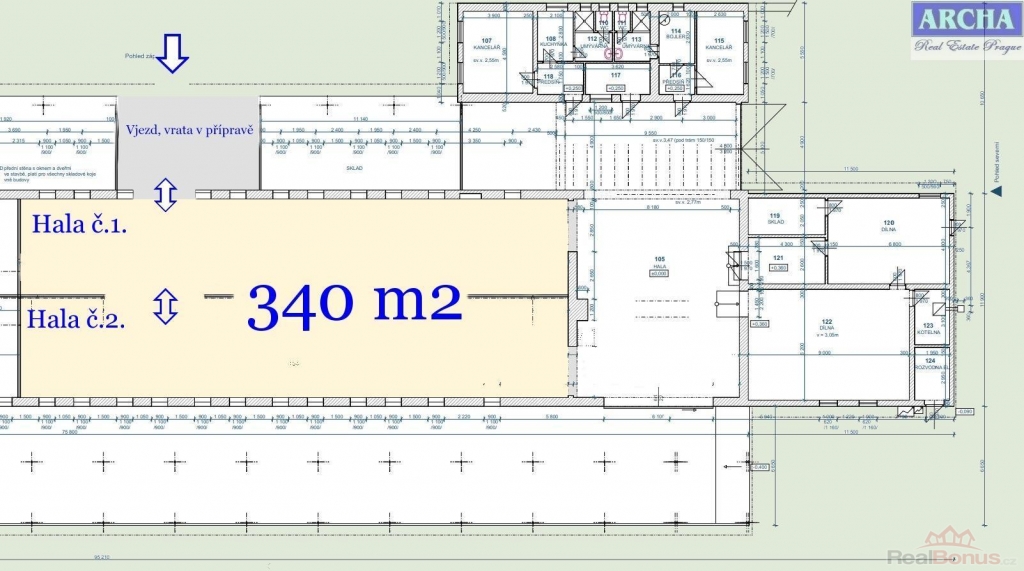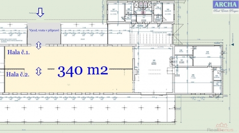 Velikost haly: 340 m2 ( zatím kovovou konstrukcí dělená na dvě části - lze uvolnit )
