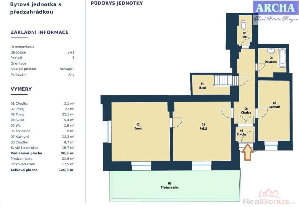 Podlahová plocha bytu činí 90,9 m2, celková plocha činí 126,3 m2 a díky orientaci na jih je prostor krásně prosvětlený po celý den.
