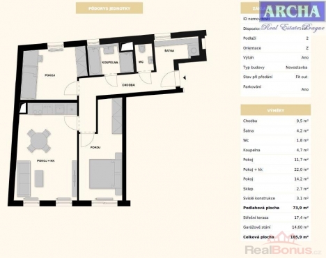 Byt o celkové ploše 105,9 m2 a podlahové ploše 73.9 m2 ve 2. podlaží nabízí velkorysý obývací pokoj s přípravou na kuchyňský kout, dvě ložnice, prostornou vstupní chodbu, praktickou šatnu a nadstandardní koupelnu svanou i sprchovým koutem a samostatnou toaletou. K bytu náleží také soukromá střešní terasa, sklepní kóje a garážové stání.