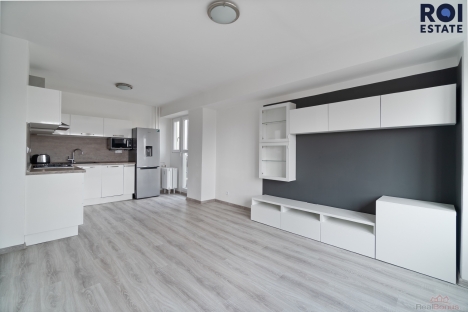 Byt je světlý a prostorný. Po vstupu do něj se ocitnete na chodbě s vestavěnou skříní, která ústí do srdce bytu ? obývacího pokoje s kuchyňským koutem. Moderní kuchyňská linka je vybavena vestavěnou myčkou, kombinovanou lednicí s mrazákem, el. troubou a plynovým sporákem. Z chodby se rovněž dostanete do koupelny s toaletou, sprchovým koutem a kombinovanou pračkou se sušičkou a dále do neprůchozí ložnice.