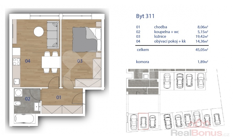 K bytu přináleží venkovní parkovací stání ve vnitrobloku a komora přímo na patře o velikosti 2 m2. Byt je vybaven kuchyňskou linkou vč. spotřebičů, předokenní žaluzie, podlahové vytápění.
