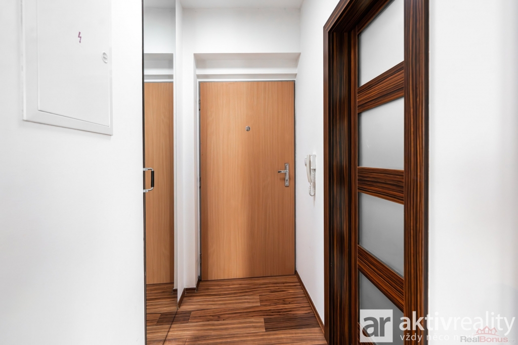 Interiér je účelně zařízen. Kuchyňská linka je vybavena lednicí, mikrovlnnou i elektrickou troubou, sklokeramickou deskou s odsáváním. V koupelně se nachází elegantní skleněný sprchový kout. Obytný prostor (23,5 m2) působí svěže a vzdušně díky dvěma velkým balkonovým dveřím vedoucím přímo na terasu. Praktickým prvkem jsou vestavěné skříně ? jedna zrcadlová ve vstupní chodbě a druhá v obytné části. Posuvné interiérové dveře šetří prostor, zatímco bezpečnostní vstupní dveře zajišťují klid. Chodba i koupelna mají denní světlo díky stropním zrcadlovým tubusům. Topení je dálkové s konvektory zabudovanými v podlaze. Budova má energetický štítek třídy C, což znamená nízké provozní náklady. Měsíční poplatky do SVJ jsou aktuálně 2.900,- Kč.