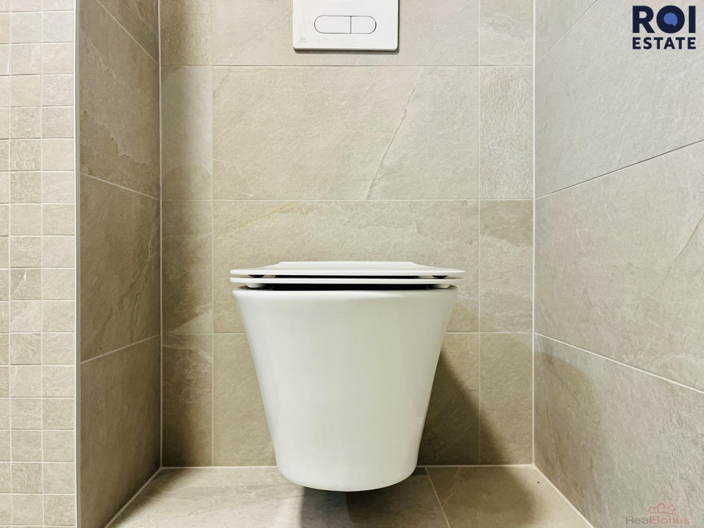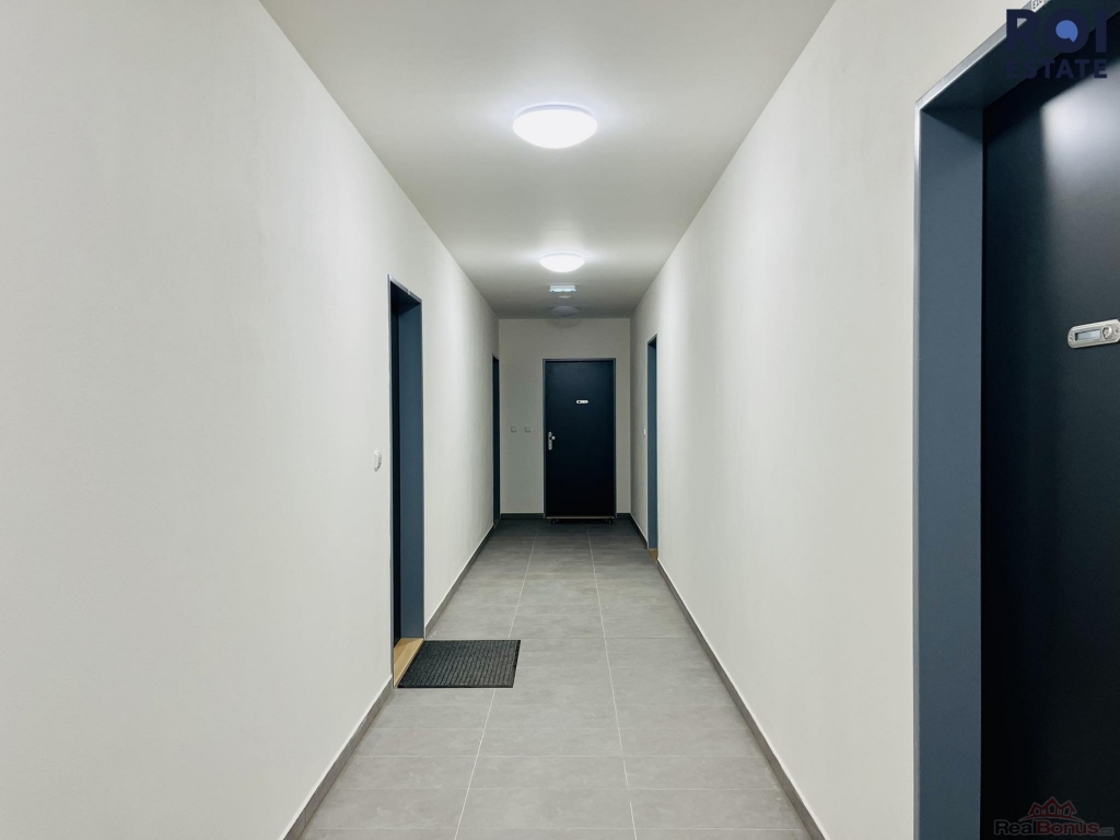 Již samotná budova Vás nadchne designem a zpracováním. Jsou zde použity kvalitní materiály včetně okrasného dřeva nebo velkoformátová dlažba s tvrzeným sklem. Při vstupu do nemovitosti se ocitneme v předsíni, která nás dostane do celého bytu. Po levé straně je krásná koupelna se sprchovým koutem a toaletou, můžete zde umístit své spotřebiče jako je například pračka či sušička nebo obojí. V rámci velké podlahové plochy je samostatný pokoj s kuchyňským koutem vhodný jak pro sedačku, postel nebo dva pracovní stoly. Vše si můžete zařídit dle Vašich potřeb a představ. Fantazii se meze nekladou! Kuchyňská linka byla vyrobena na míru a jsou zde spotřebiče jako například lednice s mrazákem, troubou či myčkou. Indukční deska je samozřejmostí. Pokud máte starost o tom, že byste v bytě cítili teplo, tak se bát nemusíte. Okna jsou vybavena předokenními žaluziemi typu Z, které zajistí tepelný komfort v domácnosti. Největší výhodou jsou také chlazené stropy, kde si sami nastavíte teplotu, kterou v nemovitosti chcete mít. Už Vás tak teda nebude trápit nepohodlí, nemoci či bolavé klouby z klimatizace.
