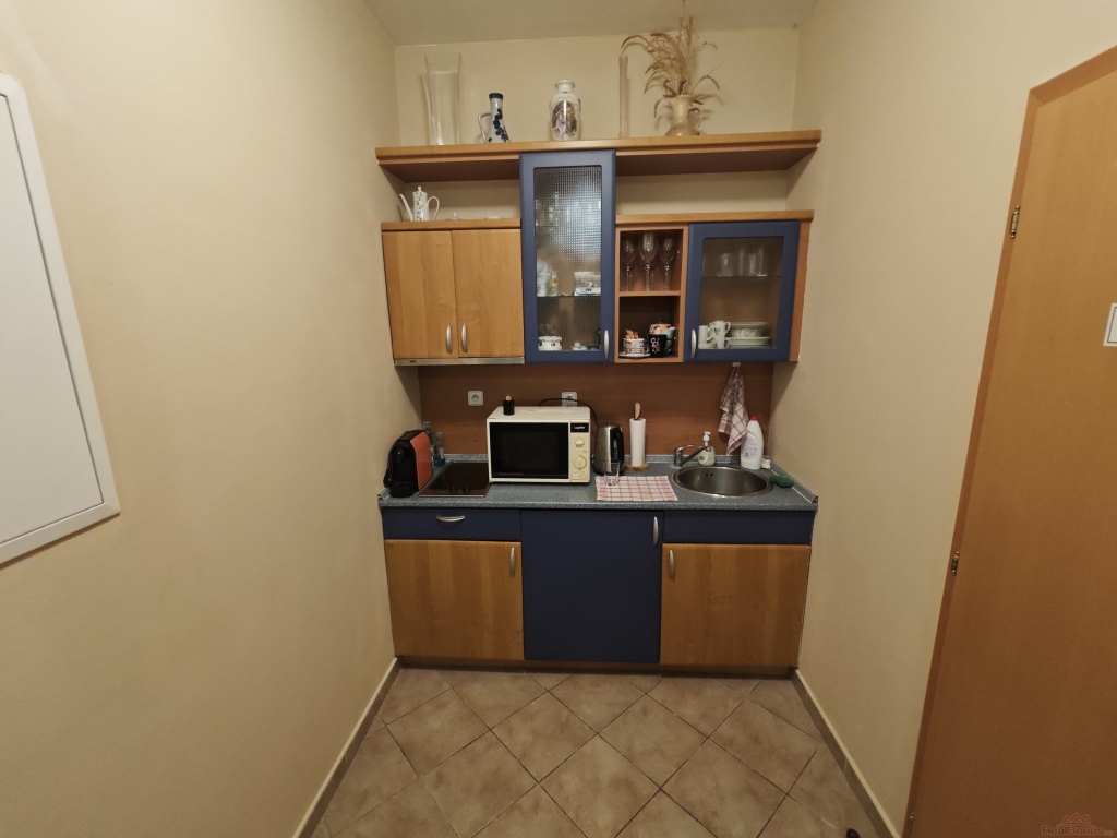 Vstupní část tvoří malá recepce, hlavní místnost, kuchyňka a příslušenství (WC, umyvadlo, úklidová komora) a dále je zde umístěn zadní vchod do společných částí bytového domu.