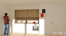 V bytě bude kuchyňská linka vyrobena na míru od stolařství FAIN Interier, vč. vestavěných spotřebičů a to elektrické trouby, indukční desky, digestoře, myčky a chladničky s mrazákem.