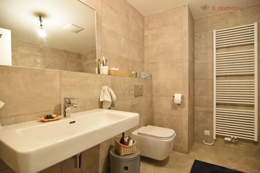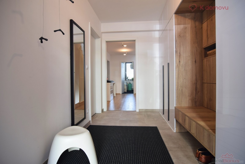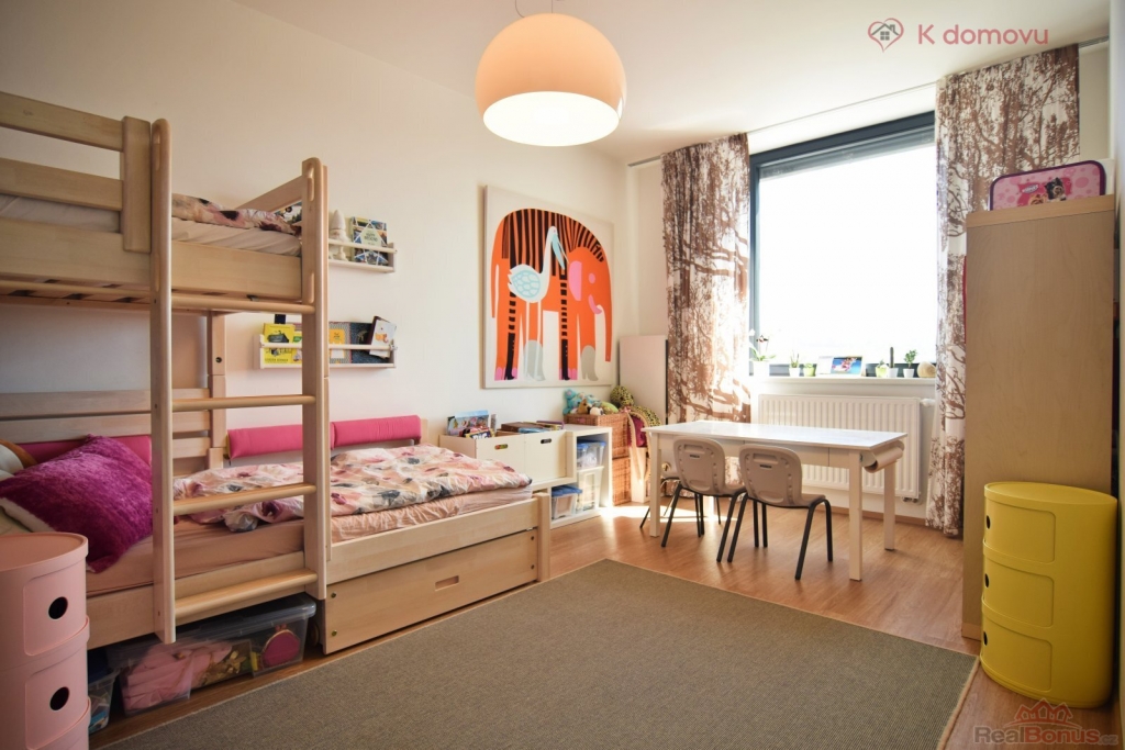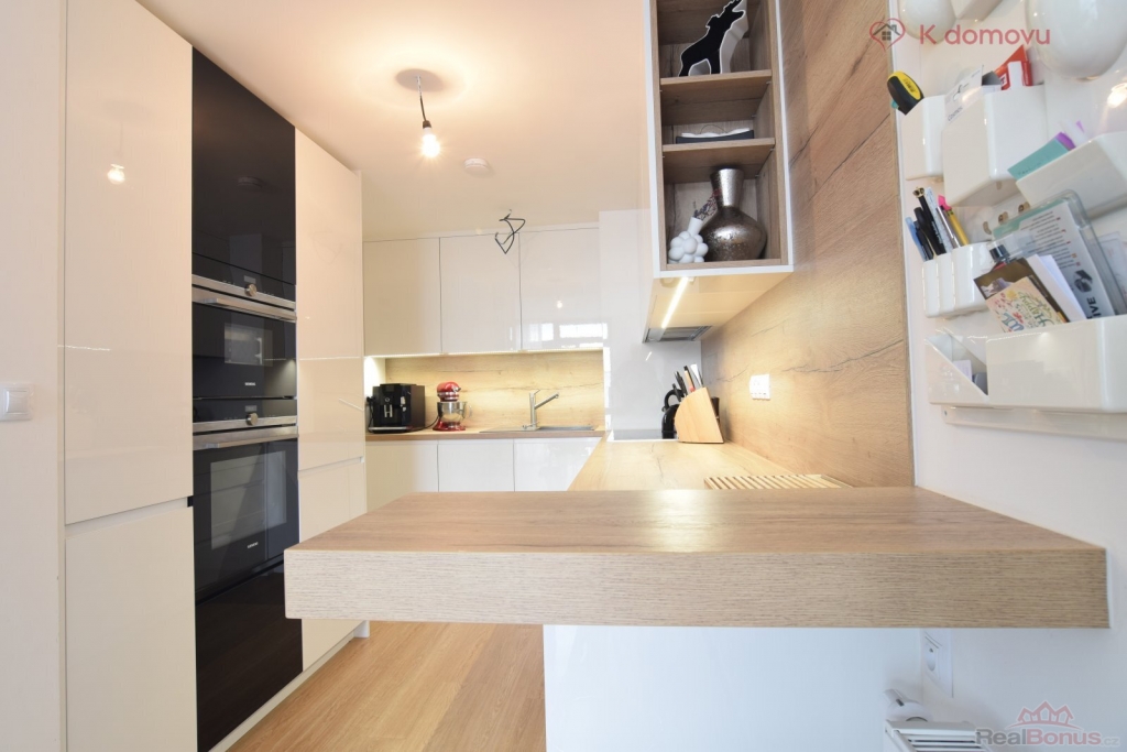 Vybavení: kuchyňská linka (indukční varná deska, horkovzdušná trouba, parní trouba, lednice, myčka (Siemens). Vestavěné skříně v zádveří a vestavěné skříně v ložnici. Náklady na bydlení jsou cca 5000 Kč/měsíc při třech osobách.