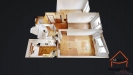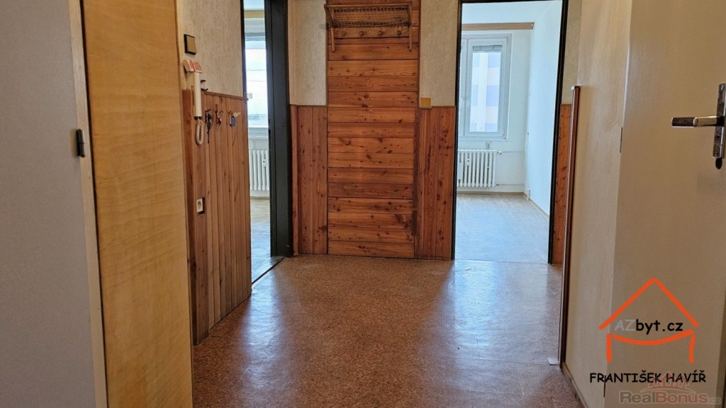 Dispozice bytu je praktická. Z předsíně se vchází do všech místností ? tří neprůchozích pokojů (19 + 13 + 11 m2), z nichž jeden má oddělený kuchyňský kout (7 m2), dále do koupelny s vanou a na samostatnou toaletu.