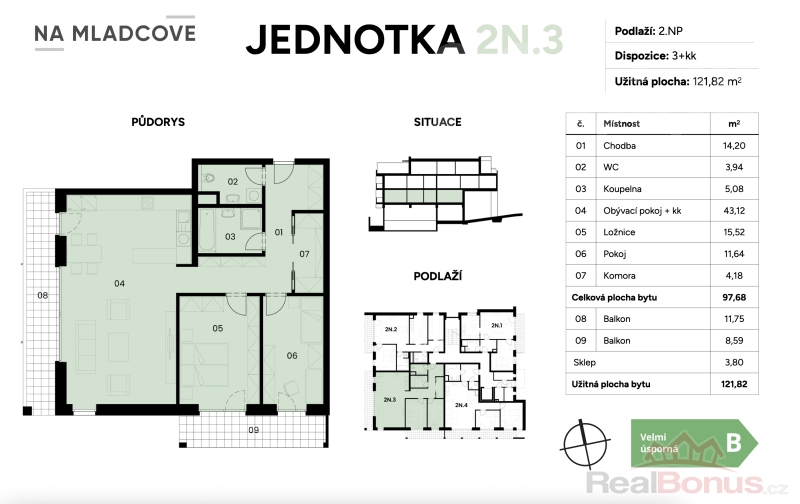 V exkluzivním zastoupení Vám nabízíme ke koupi byt o dispozici 3+kk (97,68 m2) se dvěma balkony (11,75 m2 a 8,59 m2) a sklepem (3,80 m2) ve 2.NP komorního developerského projektu "Byty na Mladcové".