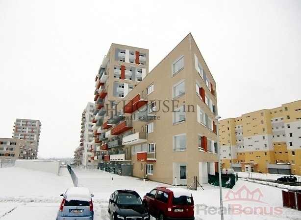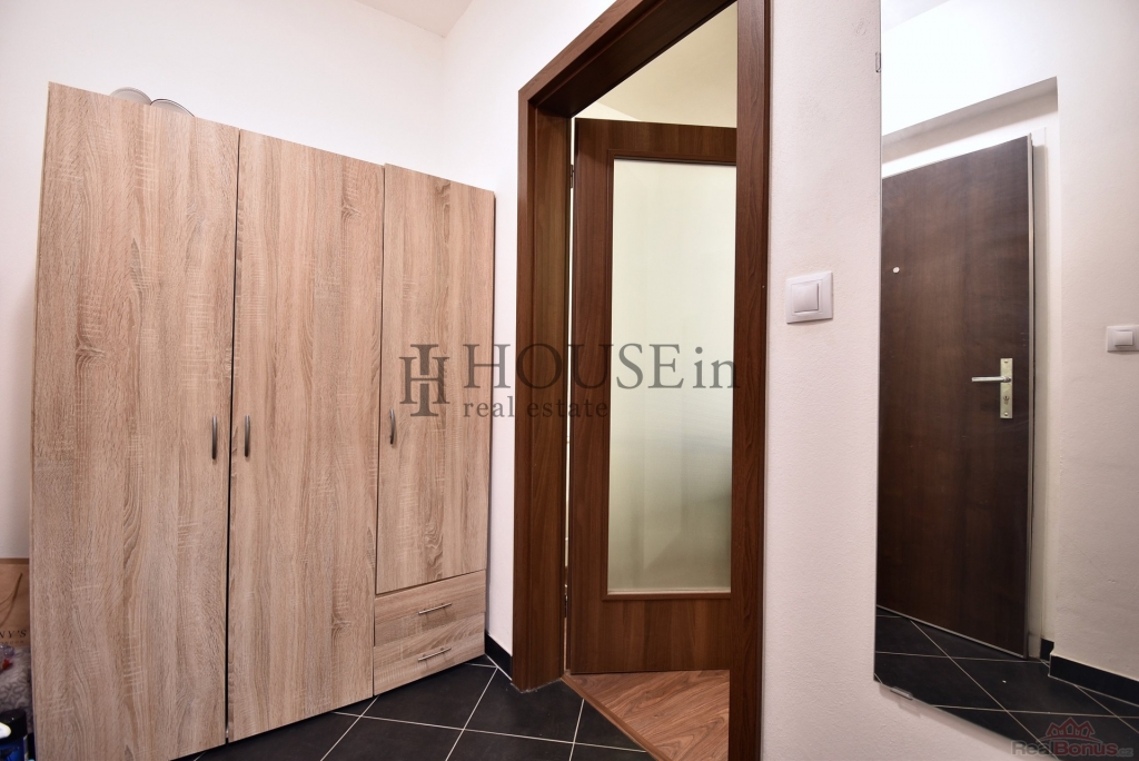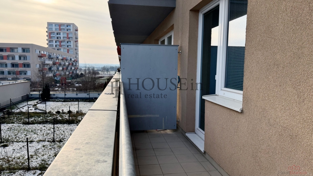 Dispozice bytu: vstupní předsíň s úložnou skříní, koupelna se sprchovým koutem, WC a pračkou, obytná místnost s kompletně vybavenou kuchyňskou linkou (elektrická trouba, sklokeramická varná deska, velká lednice s mrazákem, digestoř) a vstupem na prostorný balkón. Byt je pronajímán včetně veškerého nábytku a spotřebičů. Součástí je také velký zděný sklep umístěný na patře. K dispozici jsou bezpečnostní dveře, protipožární systém, žaluzie a možnost vysokorychlostního internetu.