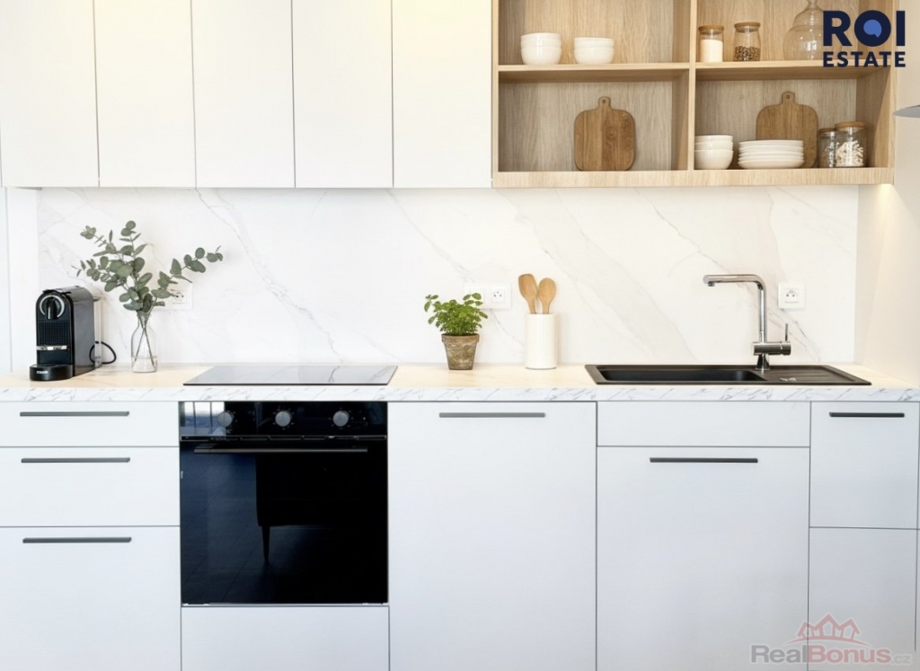 Kuchyně je moderní, nadčasová a plně vybavená ? mramorová pracovní plocha, vestavné spotřebiče a praktické úložné prostory nechávají vyniknout čistému designu.