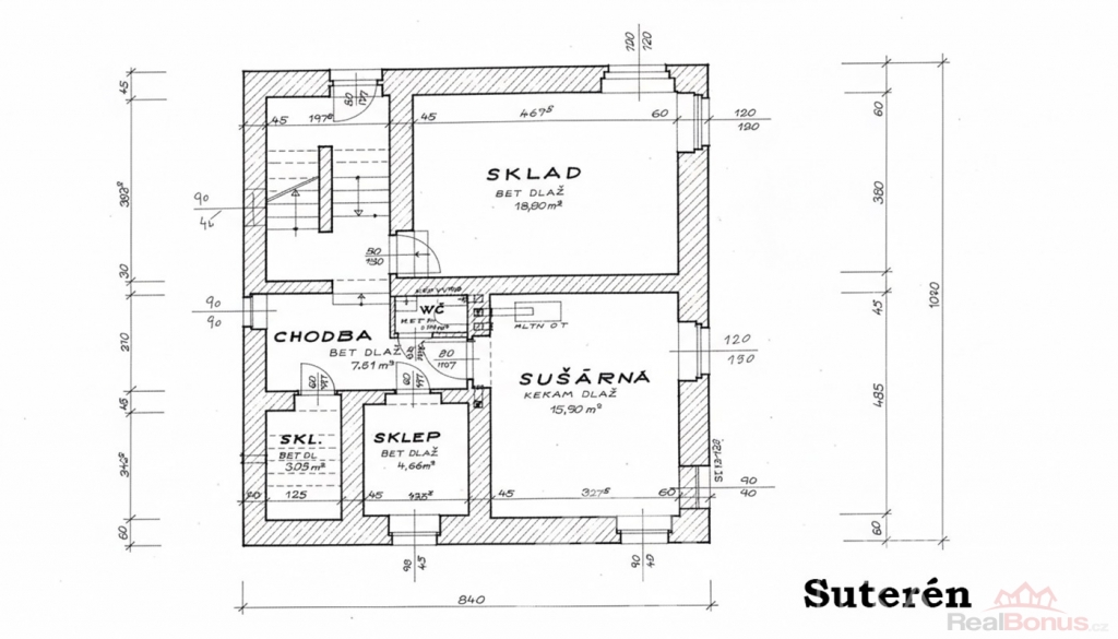 Vnitřní dispozice: 1. PP (suterén), dva sklípky o celkové ploše (7,7 m2), úložný prostor na zahradní nářadí, místnost 15,9 m2 (je zde kotel, ale je možné ho stavebně oddělit), WC s umyvadlem (1,2 m2), letní místnost (18 m2), chodba (7,6 m2), východ do zahrady, v mezipatře balkon orientovaný na jih.