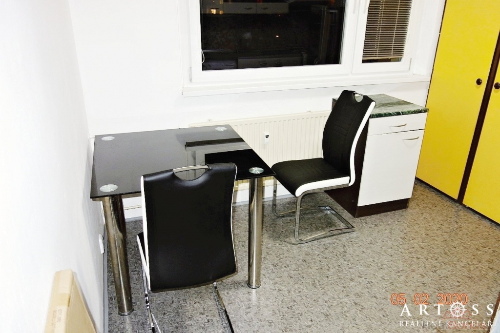 Obytný pokoj s balkonem je nevybavený. Kuchyně je zařízena linkou s plynovým sporákem, pračkou, lednicí, stolem a židlemi. Dále je zde potravinová skříň.
