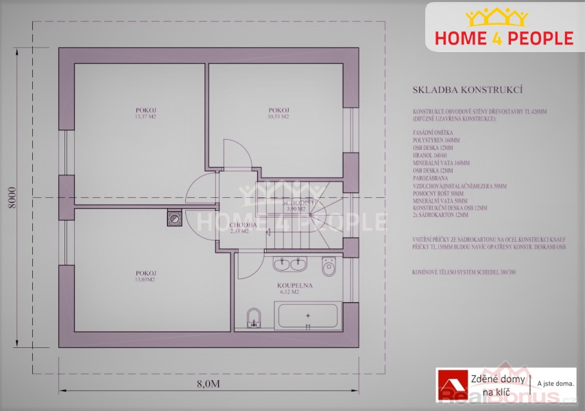 Cena včetně stavby domu na klíč, pozemku a DPH., Zprostředkujeme Vám výstavbu patrového domu 5+kk s užitnou plochou 93m v Bojkovicích. Součástí uvedené ceny je i pozemek o velikosti 1227m o šíři 13m a délce cca 88m, který je územním plánem schválen pro výstavbu rodinného bydlení. Jedná se o patrový dům, ideální až pro 5 člennou rodinu s nízkými provozními náklady. Uvedená cena je za kompletní výstavbu domu na klíč, včetně DPH, projektové dokumentace, vyřízení stavebního povolení, základové desky až po kolaudaci. V projektu jsou možné variabilní úpravy dispozice (posuny příček či oken). V uvedené ceně můžete počítat s finálními povrchovými úpravami exteriéru i interiéru, a to včetně elektroinstalací, sanitárního vybavení s bateriemi, interiérovými dveřmi včetně obložek, vytápění je řešeno teplovodním podlahovým topením v kombinaci tepelného čerpadla se 180L zásobníkem na teplou vodu. Za příplatek změníme systém vytápění nebo vystavíme komín pro krbové kamna nebo pro využití krbové vložky. Garáž spojená s domem, za příplatek. Pro náročnější klienty máme nabídku nadstandardního vybavení chytré domácnosti, klimatizaci, externí žaluzie a rolety a další. Doba výstavby cca 14 měsíců od vydání stavebního povolení a stavbu zahájíme do 10 dnů od jeho vydání. Smlouvy o dílo zašleme na vyžádání včetně vzorového položkového rozpočtu. Možnost výstavby pouze hrubé stavby za 2.816.000,-Kč. Tento typ domu Vám rádi ukážeme, který je k dispozici nedaleko Bojkovic. Seznámíte se se skladbou materiálů a můžete si tak projít dispozice domu. Podrobnější informace, včetně změny stavebního materiálu například na dřevostavbu, naleznete na webových stránkách naší spolupracující firmy Zděné domky na klíč. Máte-li svůj projekt nebo jen nějakou představu, pošlete nám ji a my vám jej naceníme. Změna na jiný typ domu je možná. Pomůžeme i s hledáním vhodného pozemku dle zaslaného zadání. Fotografie domů jsou domy, které jsme jednak realizovali, ale také vám je rádi ukážeme. Doporučuji prohlídku! Ev. číslo: 31262. Energetický štítek: A (49 kWh/m2/rok).