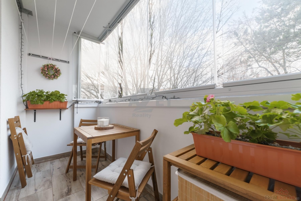Umístění bytu je v 3. patře bytového domu (4. nadzemní podlaží). Byt nabízí neprůchozí místnosti kromě obývacího pokoje. Vstup do bytu je zajištěn bezpečnostními dveřmi. V chodbě bude ponechána vestavěná skříň v níž nalezneme jedny z prvních z vychytávek - zásuvku pro nabíjení ručního vysavače a posuvné dveře do obývacího pokoje a dětského pokoje zajišťující tak úsporu místa. WC je samostatné a koupelna díky promyšlenému uspořádání umožňuje umísit nejen pračku, ale také sušičku (skříňka nad pračkou se jen přesune). Kuchyně jenž byla provedena na míru majitelům poskytuje maximální praktičnost. Varná deska nyní plynová lze zaměnit za indukční , vše je na tuto změnu připraveno. Budou ponechány samozřejmě spotřebiče včetně lednice. Dětský menší přesto dostačující a bude při předání vyklizen. Obývací pokoj je svým umístěním středobodem celého bytu a najdeme v něm i jídelní část pro celou rodinu. Bude ponechán včetně vybavení vyjma TV. Ložnice, prostorná pro standardní manželkou postel a šatní skříň. Vybavení ložnice může být ponecháno po domluvě s majiteli. Z ložnice je vstup na prostorný, zasklený balkón. Na balkóně opět najdeme vychytávky v podobě stínících rolet, uzamykatelného zasklení a zásuvky pro vánoční světýlka či elektrický gril. Ložnici lze samozřejmě prohodit s nynějším dětským pokojem a dopřát dětem více prostoru.
