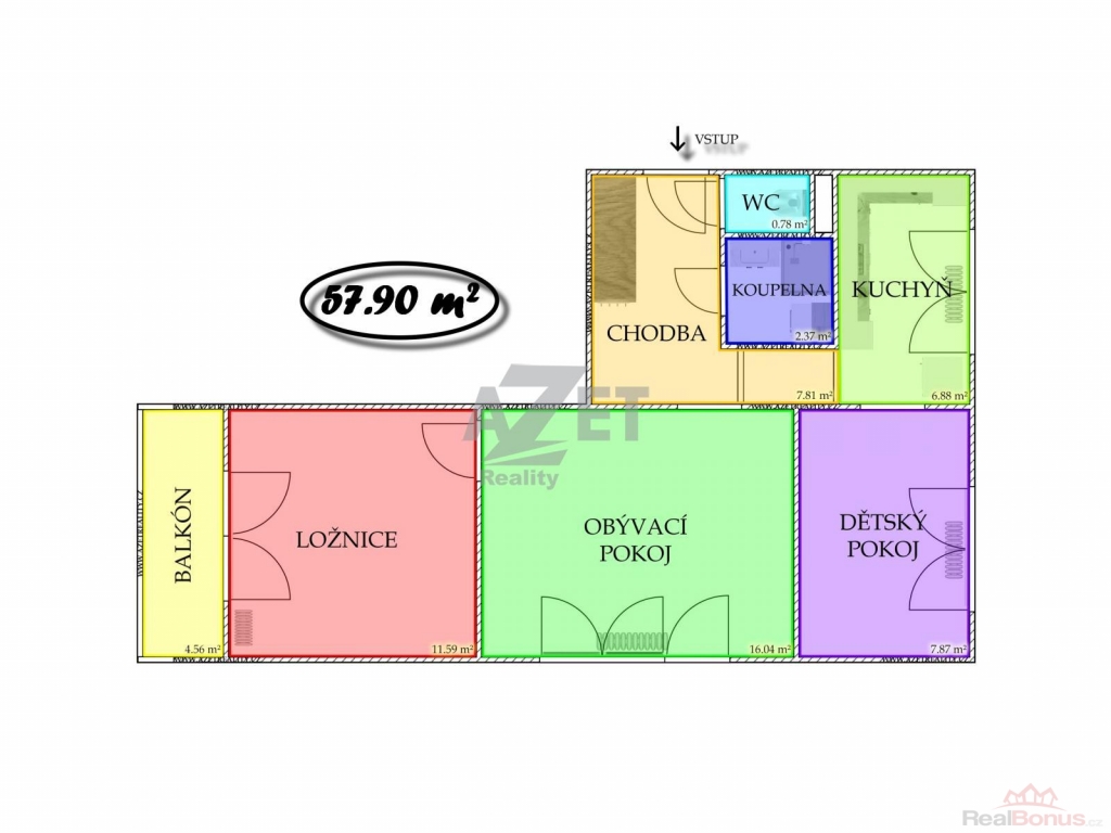 - WC - 0,78 m2 o rozměrech 0,84 x 0,92 m