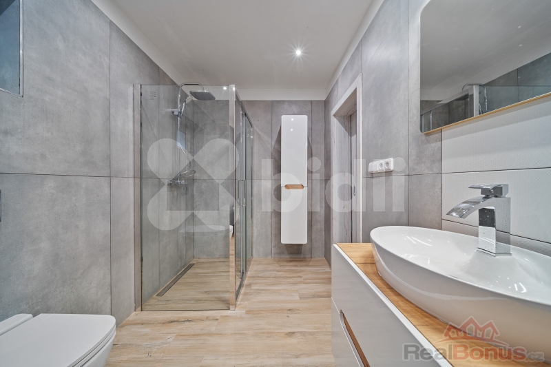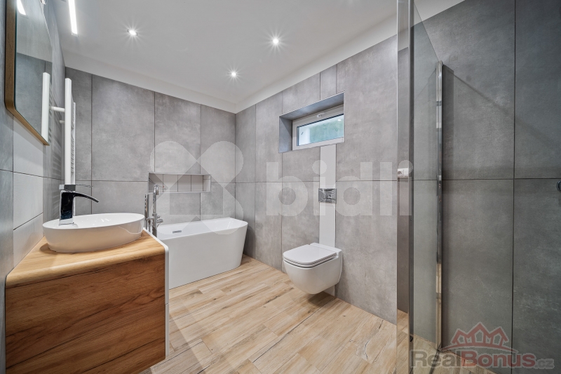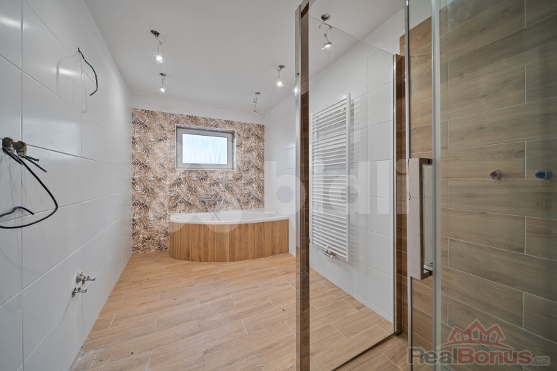 Přízemí: vstupní chodba, technická místnost, samostatná toaleta, koupelna s vanou i sprchovým koutem. Dominantou přízemí je velký obývací pokoj s kuchyní a krbem, který je připraven k obložení dle vašich představ. Z obýváku vedou dveře přímo na zahradu s terasou, kde můžete nerušeně relaxovat. Dále se v přízemí nachází dva samostatné pokoje a druhá koupelna se sprchovým koutem, vanou a toaletou.