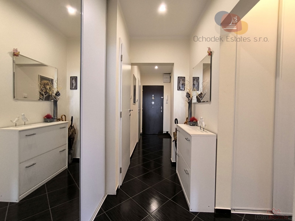 Kompletní rekonstrukce bytu tu proběhla v roce 2012 ale vše je tak pečlivě udržované a nadčasově navržené, že tu roky užívání nejsou prakticky znát. Dřevěné podlahy bez škrábanců, bezchybné podlahové vytápění v chodbě i koupelně, kuchyň ve vysokém lesku, chytré nastavitelné osvětlení.