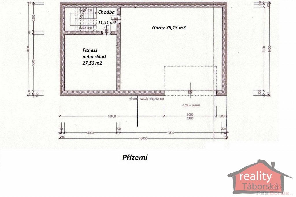 Přízemí: veliká garáž (79,13m2), místnost vhodná jako pracovna, fitness nebo sklad (27,50m2). Chodba (11,51m2).