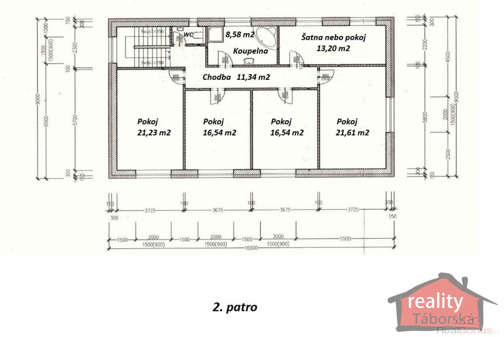 2. patro: chodba (11,34m2), pokoj (21,23m2), pokoj (21,61m2), pokoj (16,54m2), pokoj (16,54m2), šatna (13,20m2), koupelna se sprch. koutem, vanou a dvěma umyvadly (8,58m2) a samostatná toaleta (1,90m2).