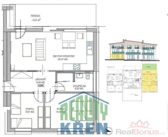 Součástí apartmánu je terasa 20 m2 a předzahrádka 30 m2, orientované na západní stranu.