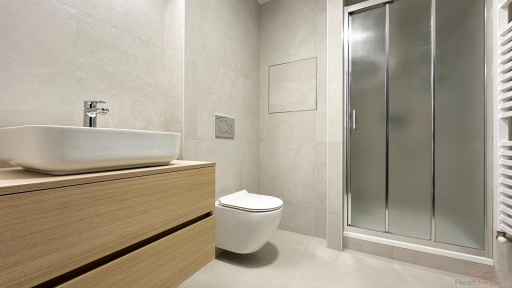 Apartmán se pronajímá částečně vybavený ? k dispozici je nová kuchyňská linka s elegantní kombinací černé a dřeva, včetně spotřebičů (myčka, lednice, varná deska, trouba, mikrovlnka). Obytný prostor působí vzdušně díky vysokým oknům a světlým podlahám. Koupelna je moderní a prostorná ? sprchový kout, umyvadlová skříňka, toaleta a pračka.