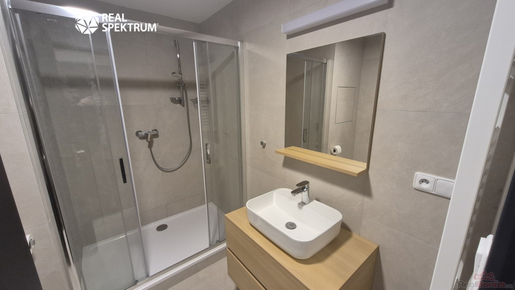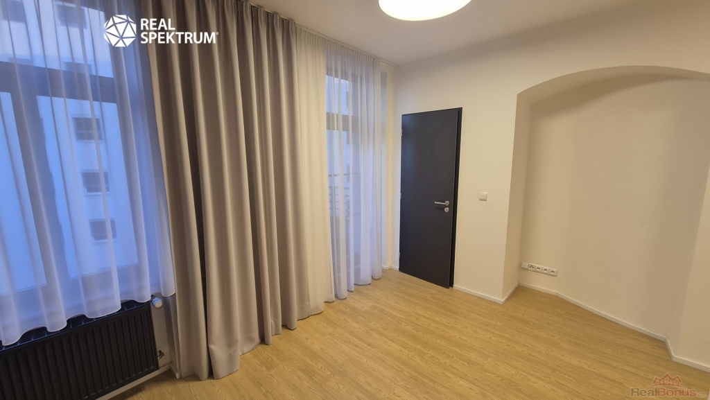 Apartmán se pronajímá částečně vybavený ? k dispozici je nová kuchyňská linka s elegantní kombinací černé a dřeva, včetně spotřebičů (myčka, lednice, varná deska, mikrovlnka). Obytný prostor působí vzdušně díky vysokým oknům a světlým podlahám. Koupelna je moderní a prostorná ? sprchový kout, umyvadlová skříňka, toaleta a pračka.