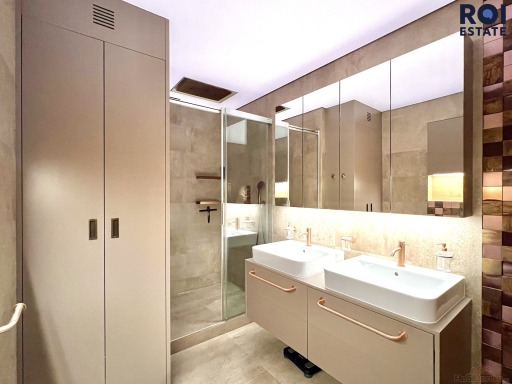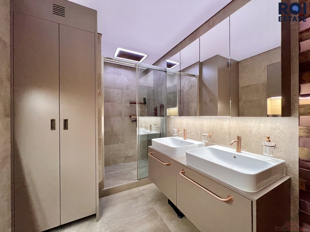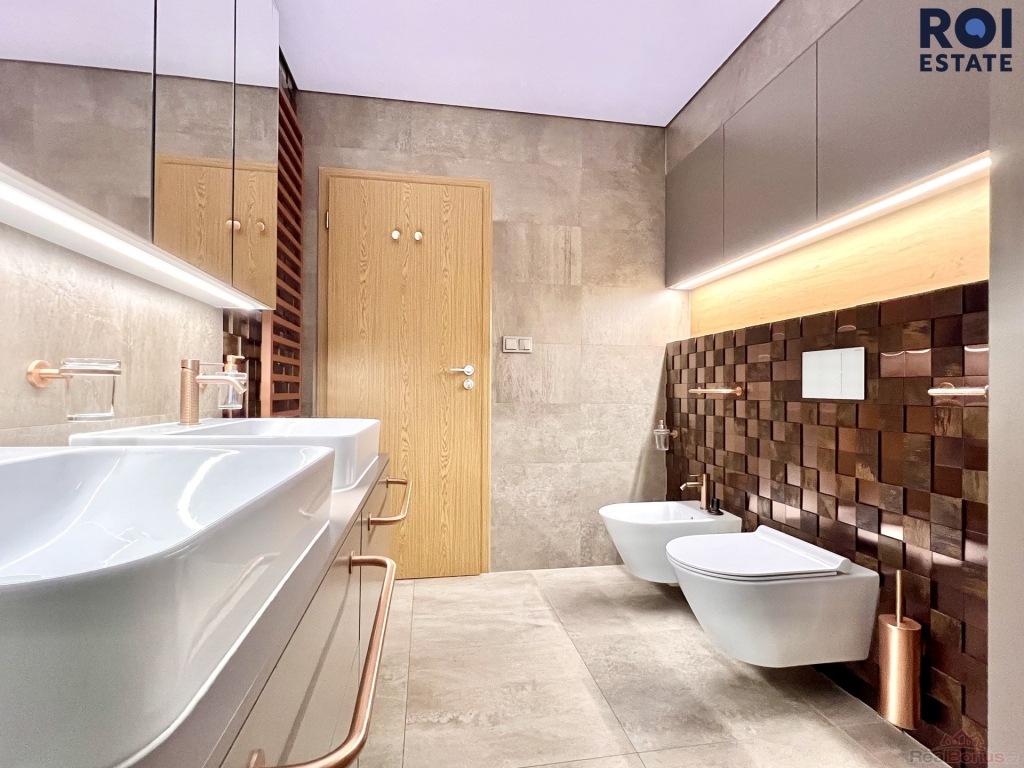 Koupelna a WC: Koupelna vybavena designovými obklady, elegantním řešením osvětlení ve stropě, zážitkovou sprchou, vestavěnou pračkou i sušičkou. Součástí koupelny jsou také dvě umyvadla nebo například bidet i WC. Součástí bytu je taktéž ještě jedna oddělená toaleta.
