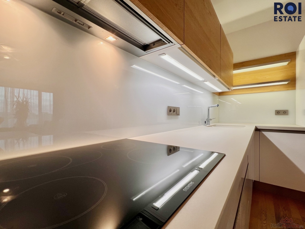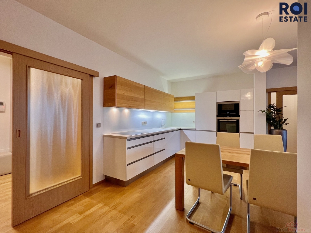 Hlavní místnost: tato část bytu je vybavena moderní kuchyňskou linkou vč. všech spotřebičů od značky Siemens. nachází se zde spotřebiče jako: vestavěná mikrovlnná trouba, trouba, sklokeramická deska, myčka, lednice a mraznička. Součástí této prostorné místnosti je také jídelna a obývací prostor ze kterého lze vstoupit na hlavní terasu. Vše kompletně zařízeno vč. kvalitních kožených sedaček, televize, reproduktorů a dalšího vybavení.