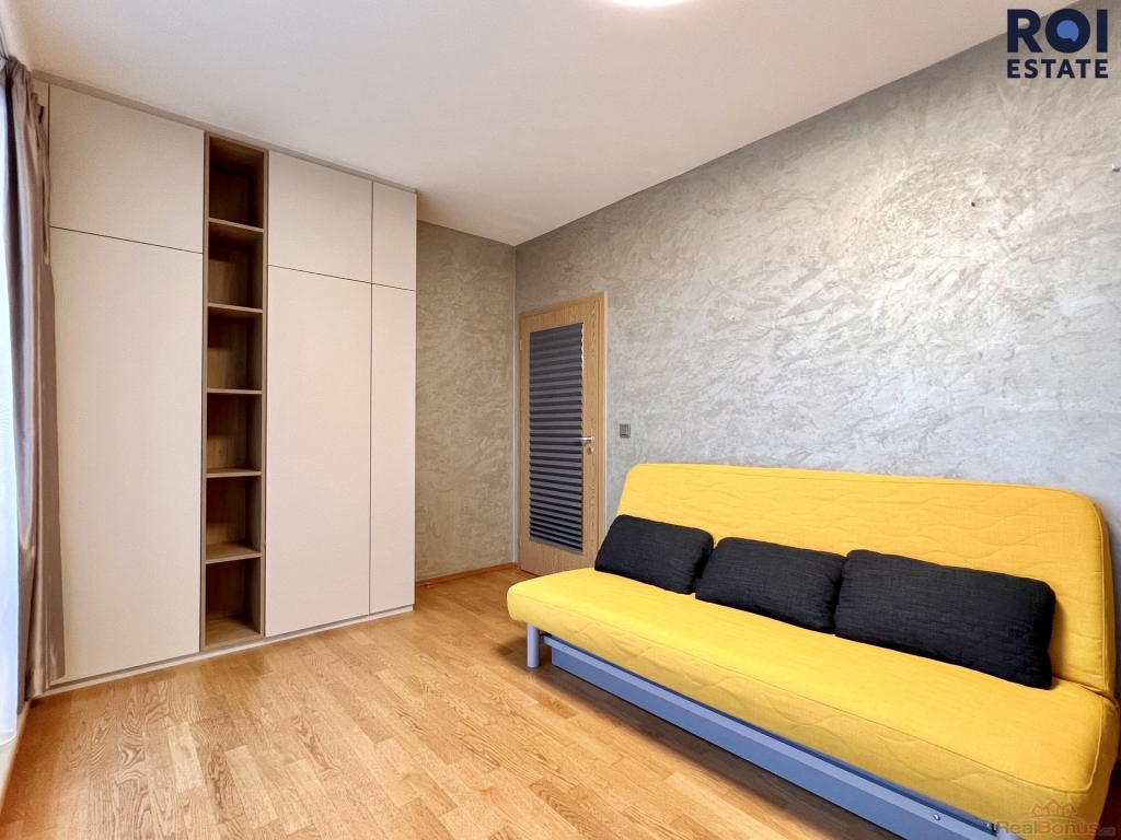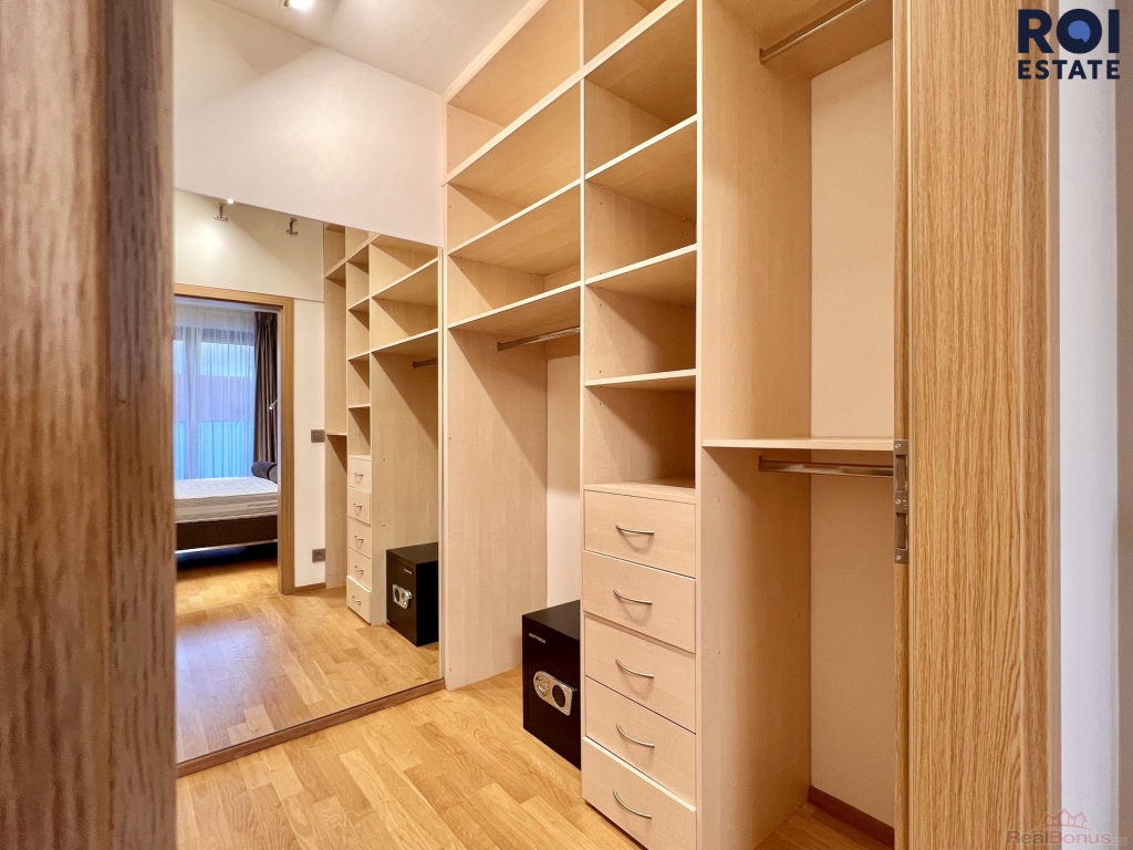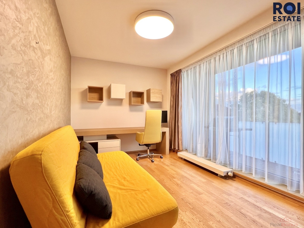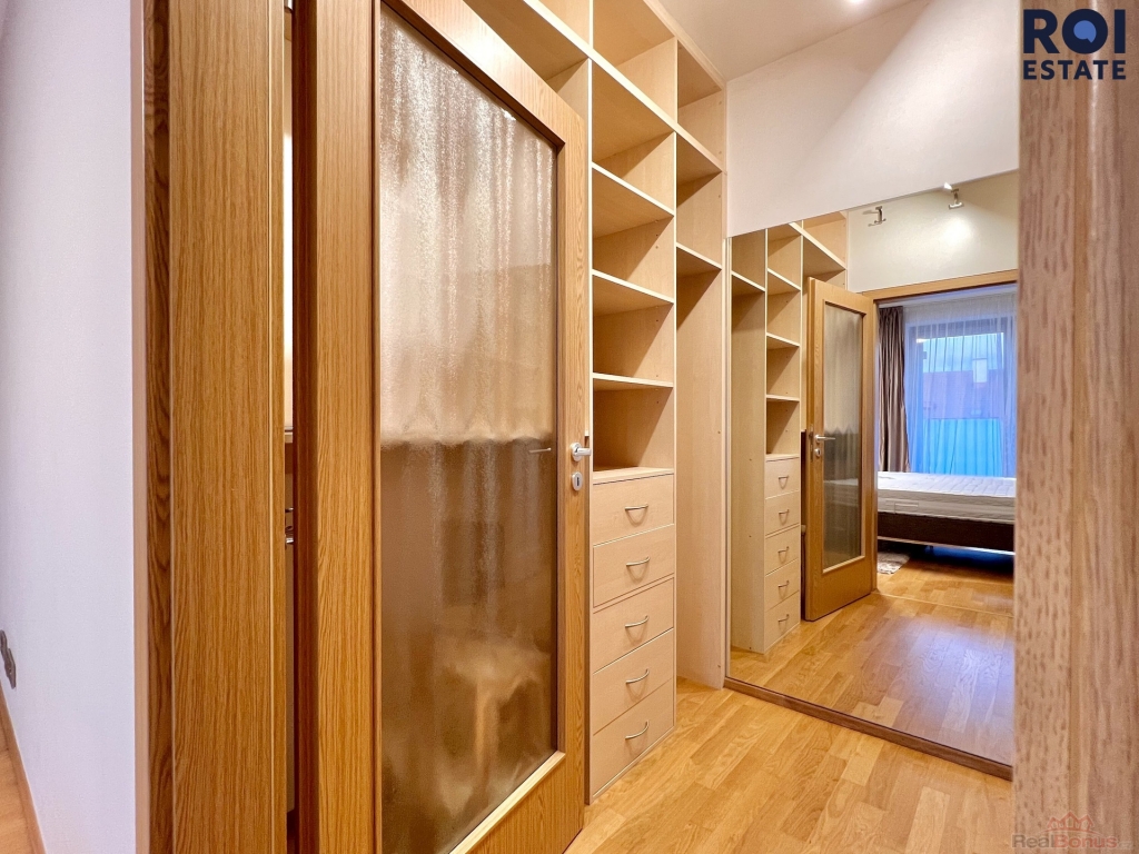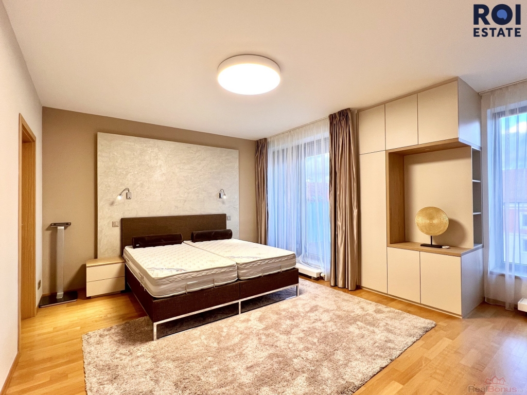 1. Ložnice: vybavena manželskou postelí vč. kvalitní matrace a vestavěného nábytku. Bezpochyby největší výhodou ložnice je oddělená šatna navržená firmou Woodface, která k ní náleží a menší soukromý balkon.